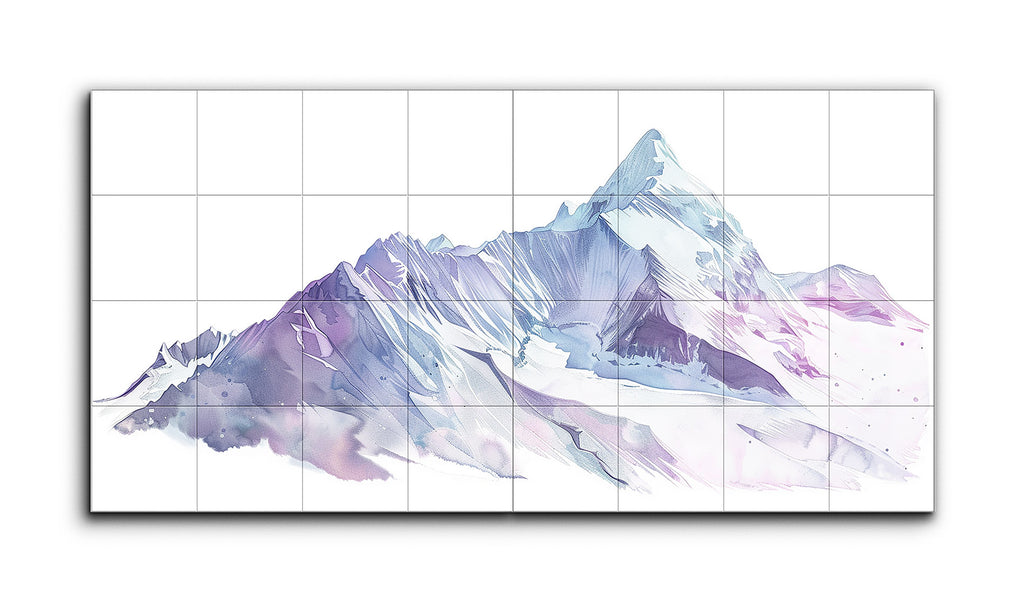 This tile mural features a modern, abstract depiction of a mountain range, split into two panels forming a cohesive work. The scene showcases sharp, jagged peaks that convey rugged natural grandeur. With an ethereal blend of brushstrokes, the artwork uses cool tones of blue, purple, and white to evoke icy, snow-covered mountains, accented by warmer hues hinting at sunlight or geological diversity. The impressionistic style captures the essence of the landscape, blending solidity with fluidity.