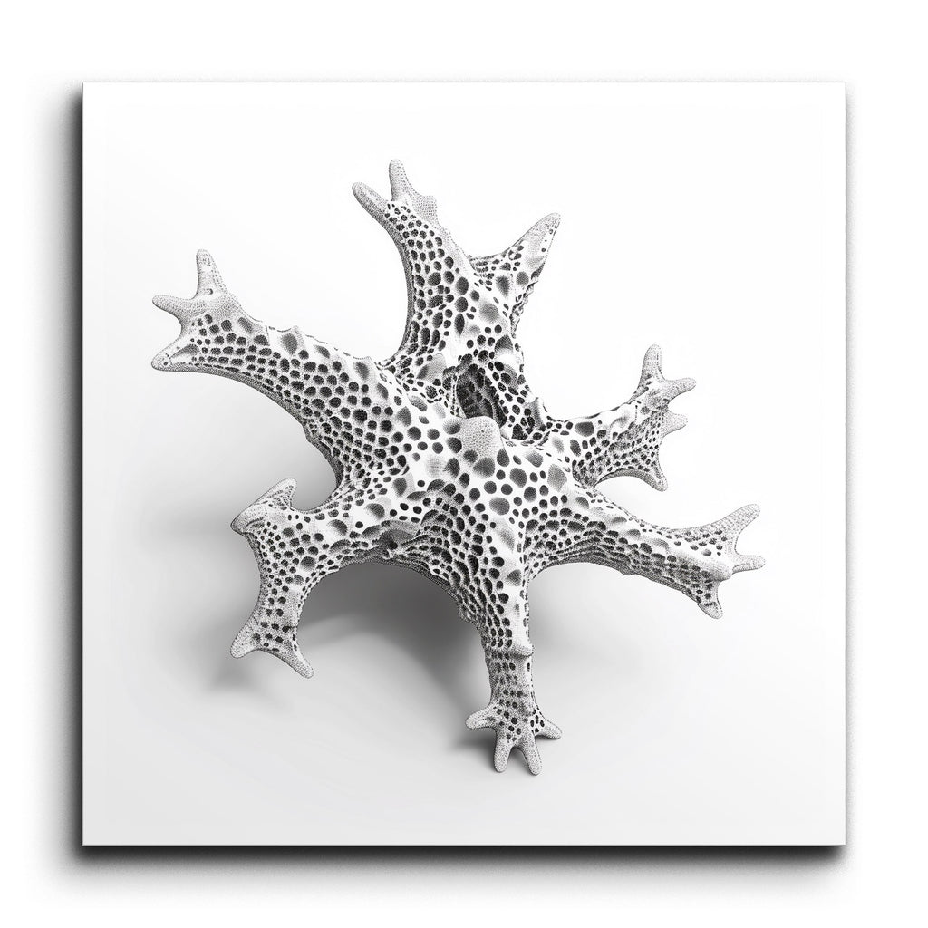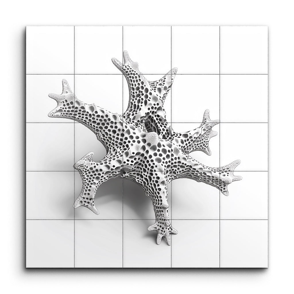 Transform your space with this captivating tile mural, featuring an intricate three-dimensional structure that evokes an abstract, organic form. Its complex, branching design and porous, skeletal appearance draw the eye, while smooth yet detailed textures create a mesmerizing pattern of small circular holes. The monochromatic shades of white and gray highlight the form's depth and intricacy, offering a modern and abstract aesthetic that plays beautifully with light and shadow. This mural is a dynamic centerpiece that adds sophistication and visual intrigue to any setting.
