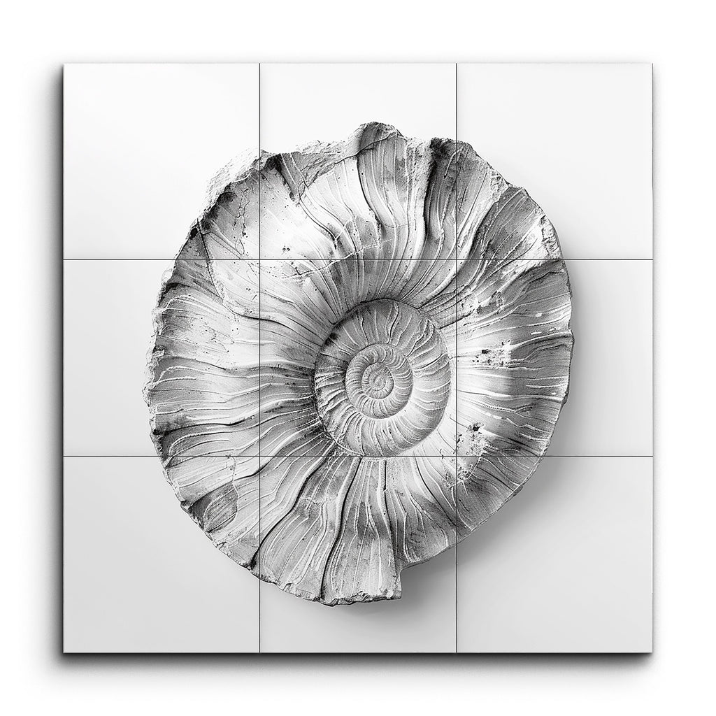 Transform your space with this captivating tile mural featuring a meticulously detailed ammonite fossil. Rendered in shades of gray, the artwork captures the intricate textures and spiral structure of the ancient fossil. Each progressively larger whorl radiates fine ridges and grooves, adding depth and dimension. The rough, irregular edges suggest natural wear over time. This realistic, monochromatic piece highlights the fossil's natural beauty and complexity, making it a striking focal point.