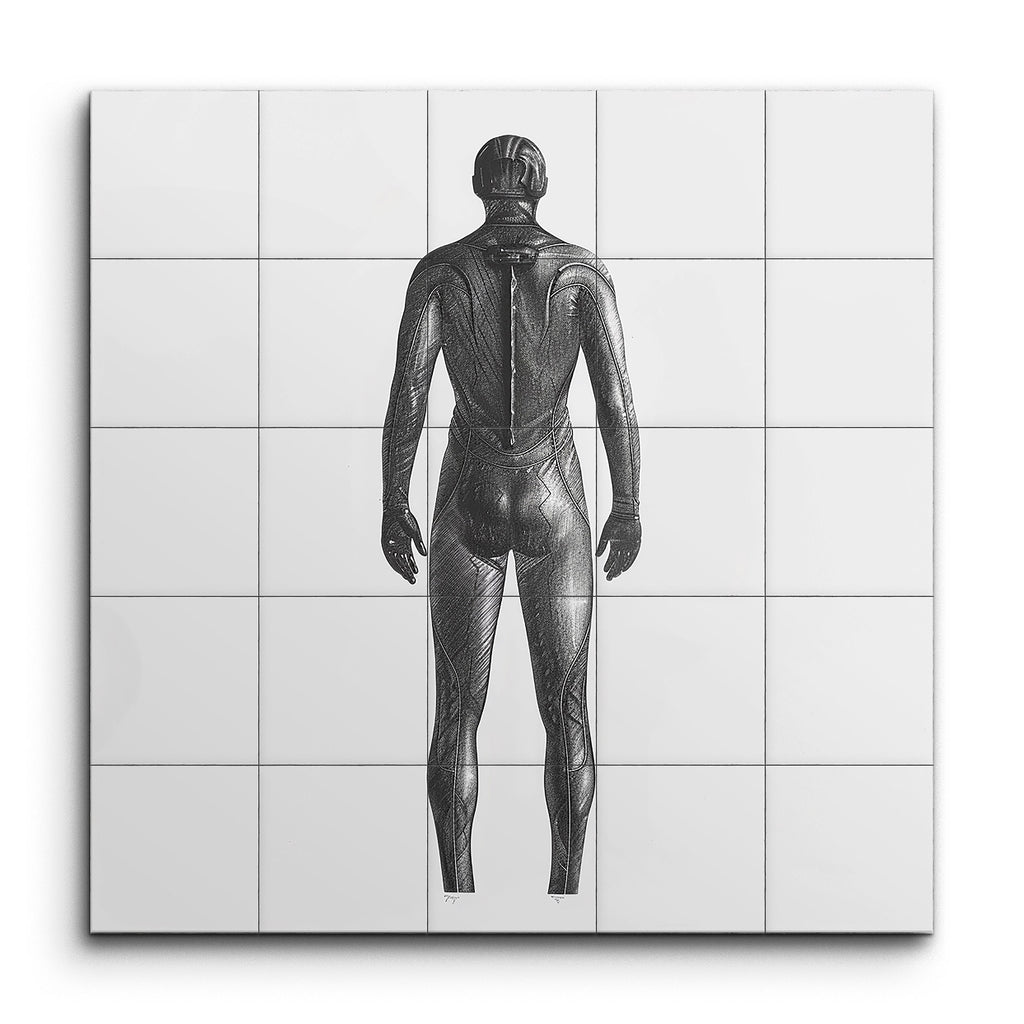 Transform your space with this captivating tile mural, showcasing a meticulously detailed anatomical illustration of the human musculature. Viewed from the back, the figure stands in a neutral pose, revealing the intricate beauty of each muscle group. The scientific precision and realistic shading offer an educational yet visually striking depiction, reminiscent of classic medical illustrations, making it a perfect blend of art and anatomy for any setting.