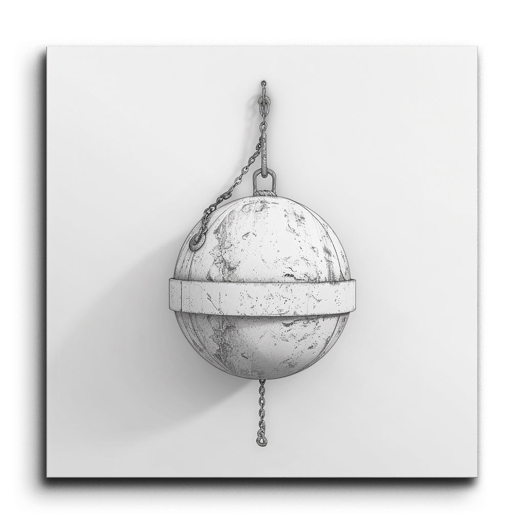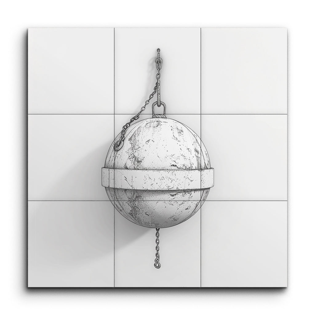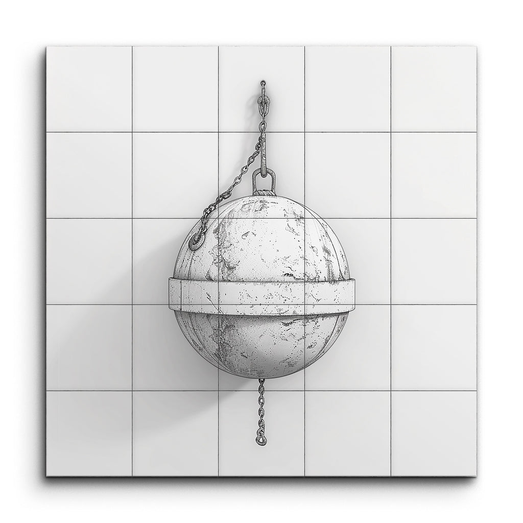 Immerse your space in industrial elegance with this captivating tile mural. The artwork features a weathered buoy, detailed with a textured surface that tells a story of time and endurance. A thick band encircles its middle, while a chain extends from the top, suggesting an anchored existence. Monochromatic shades of gray and precise lines evoke a blueprint-like quality, blending minimalist aesthetics with a touch of realism. Perfect for adding a functional yet visually striking element to any room.