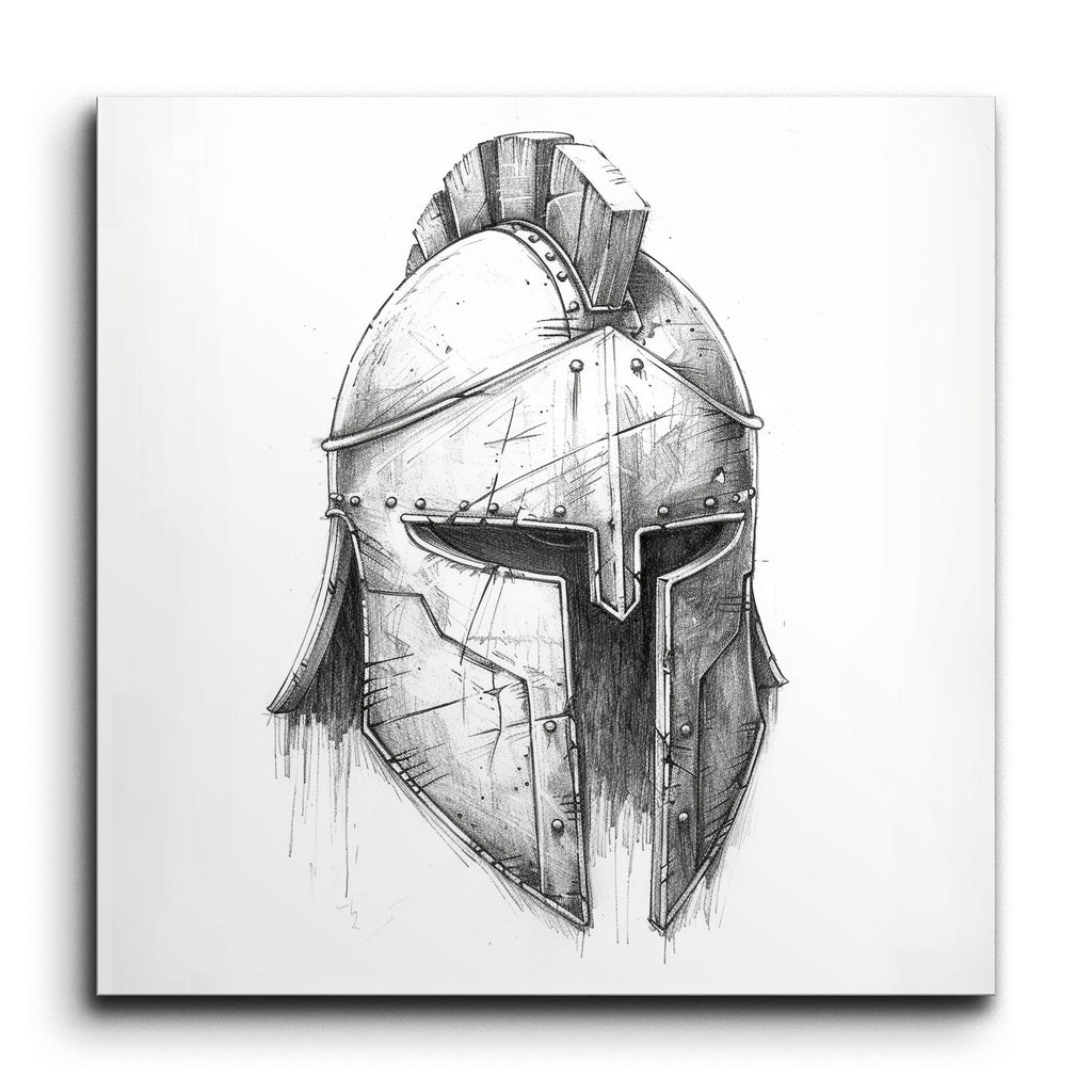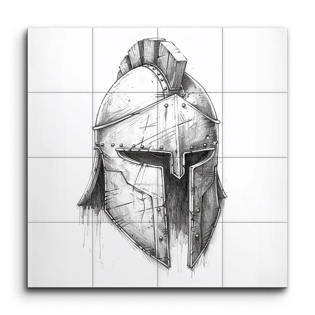Immerse yourself in history with this captivating tile mural featuring a meticulously detailed illustration of an ancient warrior's helmet. The robust design, highlighted by a prominent segmented crest and a T-shaped opening for the eyes and mouth, exudes strength and intimidation. The monochromatic palette, with its fine lines and shading, creates a three-dimensional effect, capturing the metallic sheen and battle-worn texture. This evocative artwork conveys resilience and power, making a striking statement in any space.