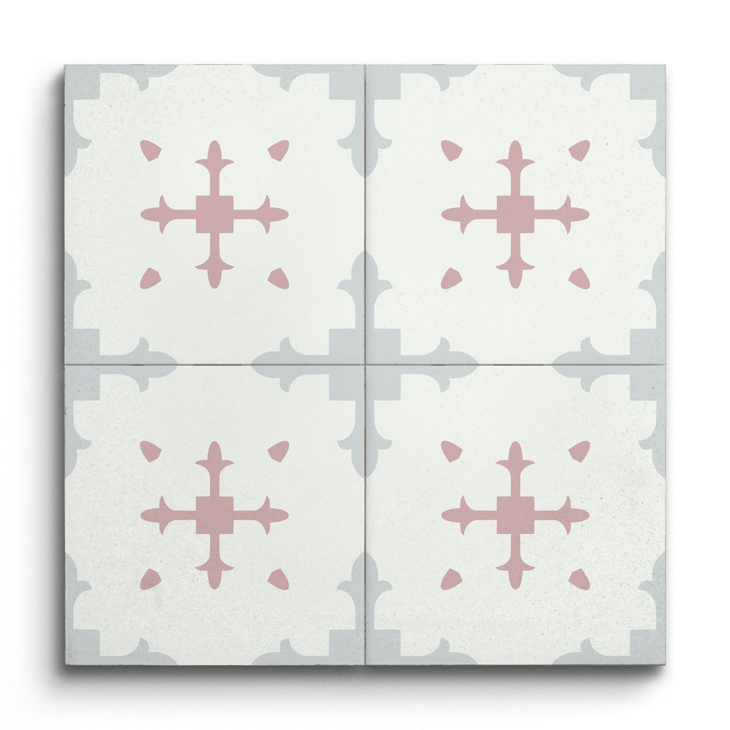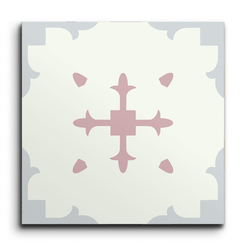 This decor tile showcases a harmonious symmetrical design, centered around a cross-like motif. Encircled by elegant curved and pointed shapes, the pattern exudes a sense of balance and grace. The soft, muted palette features a pale pink central design on a creamy white background, with light gray accents enhancing the corners. This tile captures the essence of traditional encaustic styles, offering a classic and timeless appeal.