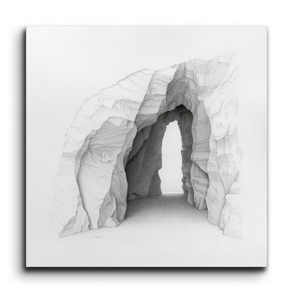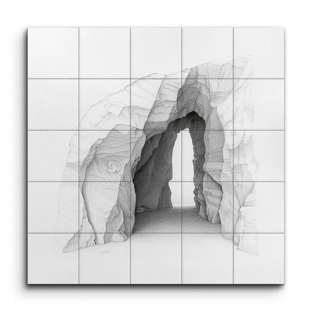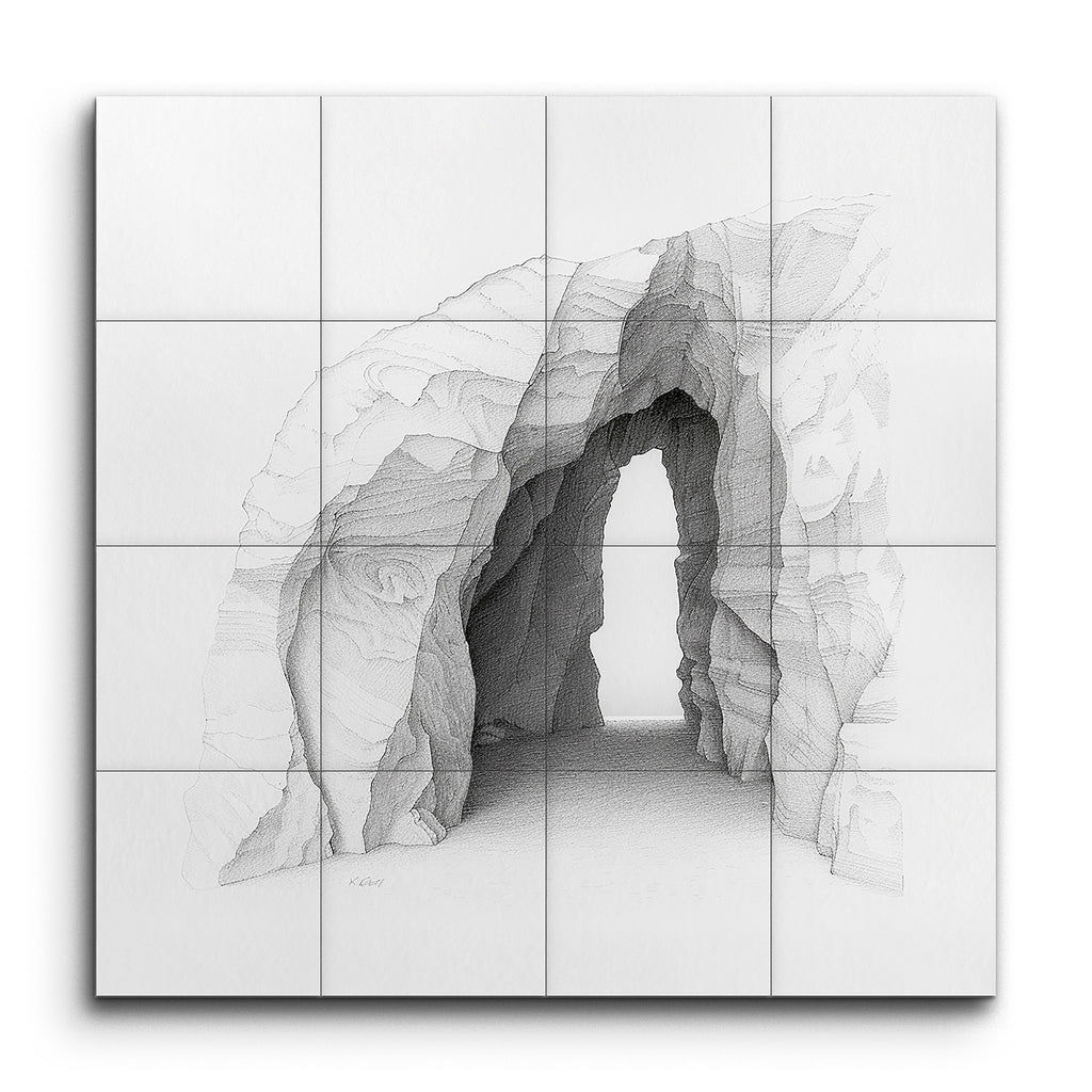Transform your space with this captivating tile mural, featuring a meticulously detailed pencil drawing of a natural rock formation with a central archway. The minimalist and monochromatic style highlights the intricate textures and contours of the rugged rock surface. Fine lines and expert shading create a sense of depth and realism, with light emanating from within the tunnel, casting subtle shadows and illuminating the arch's inner surfaces. This artwork invites you to gaze through the archway and imagine the mysteries beyond.