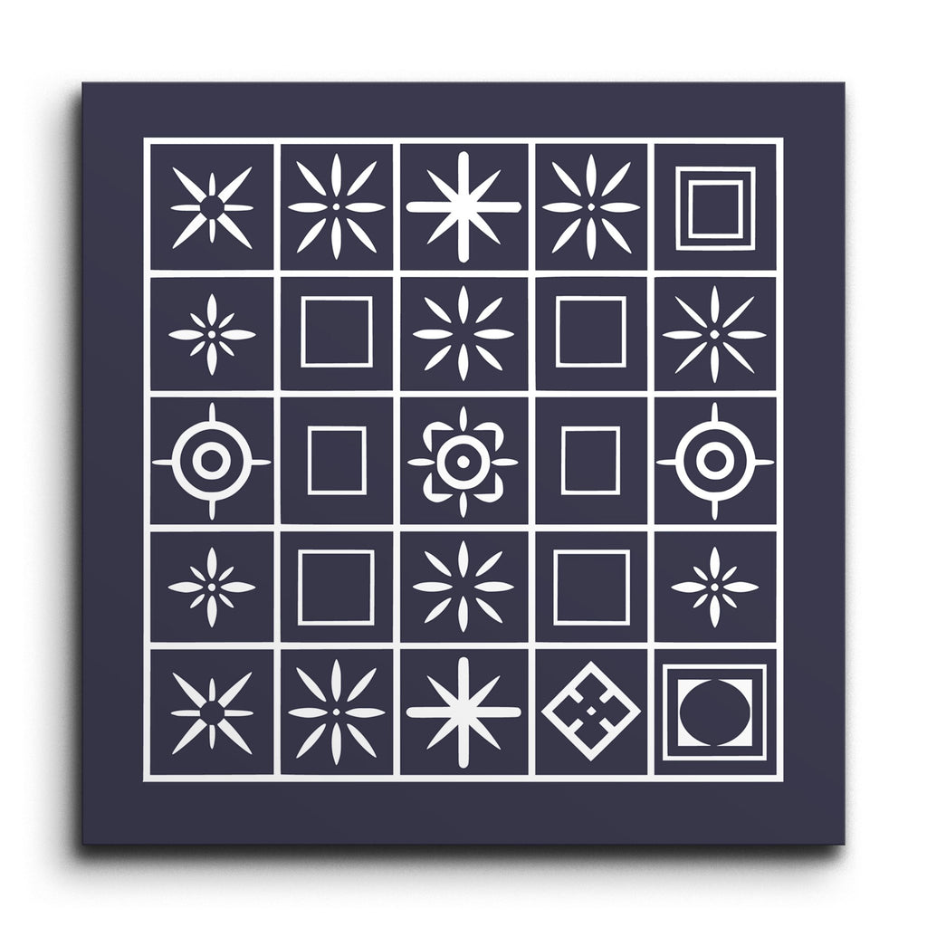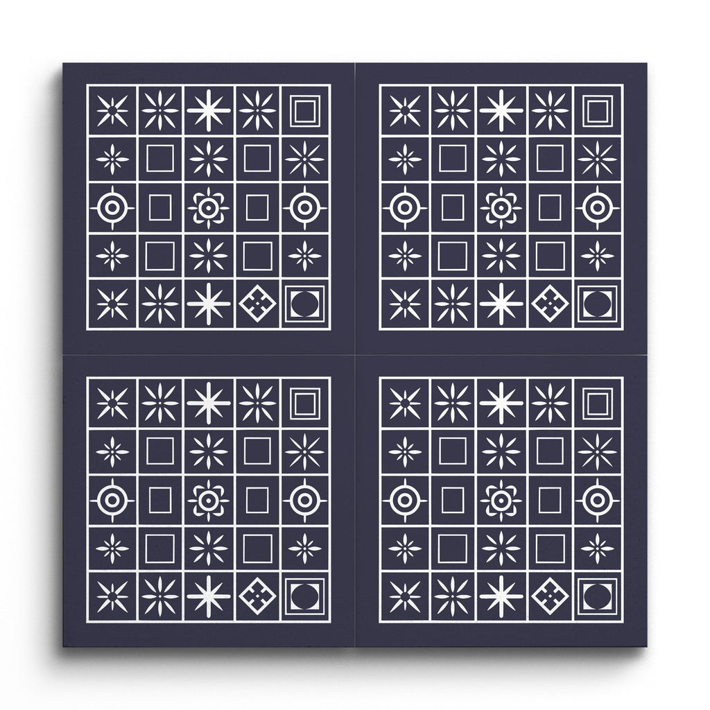 This decor tile showcases a captivating grid of squares, each adorned with its own unique geometric design, including stars, circles, and squares. The interplay of navy blue and white creates a striking contrast that highlights the crisp and clean aesthetic. The symmetrical arrangement and varied compositions within each square offer a modern, structured look. This tile brings together simple shapes in a harmonious blend of order and individuality, perfect for those who appreciate contemporary design with a touch of elegance.