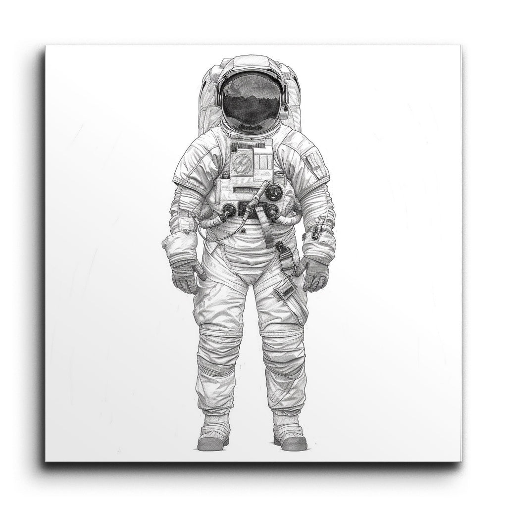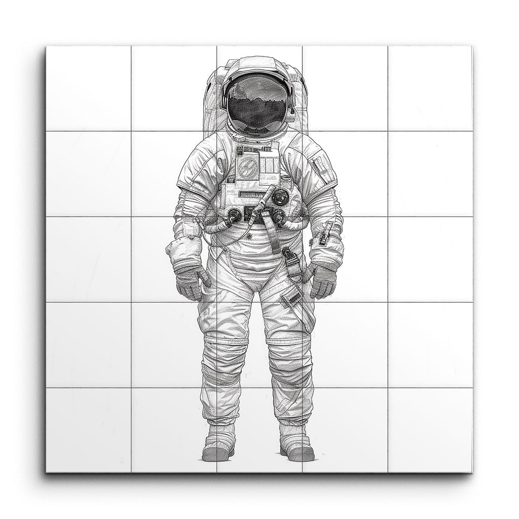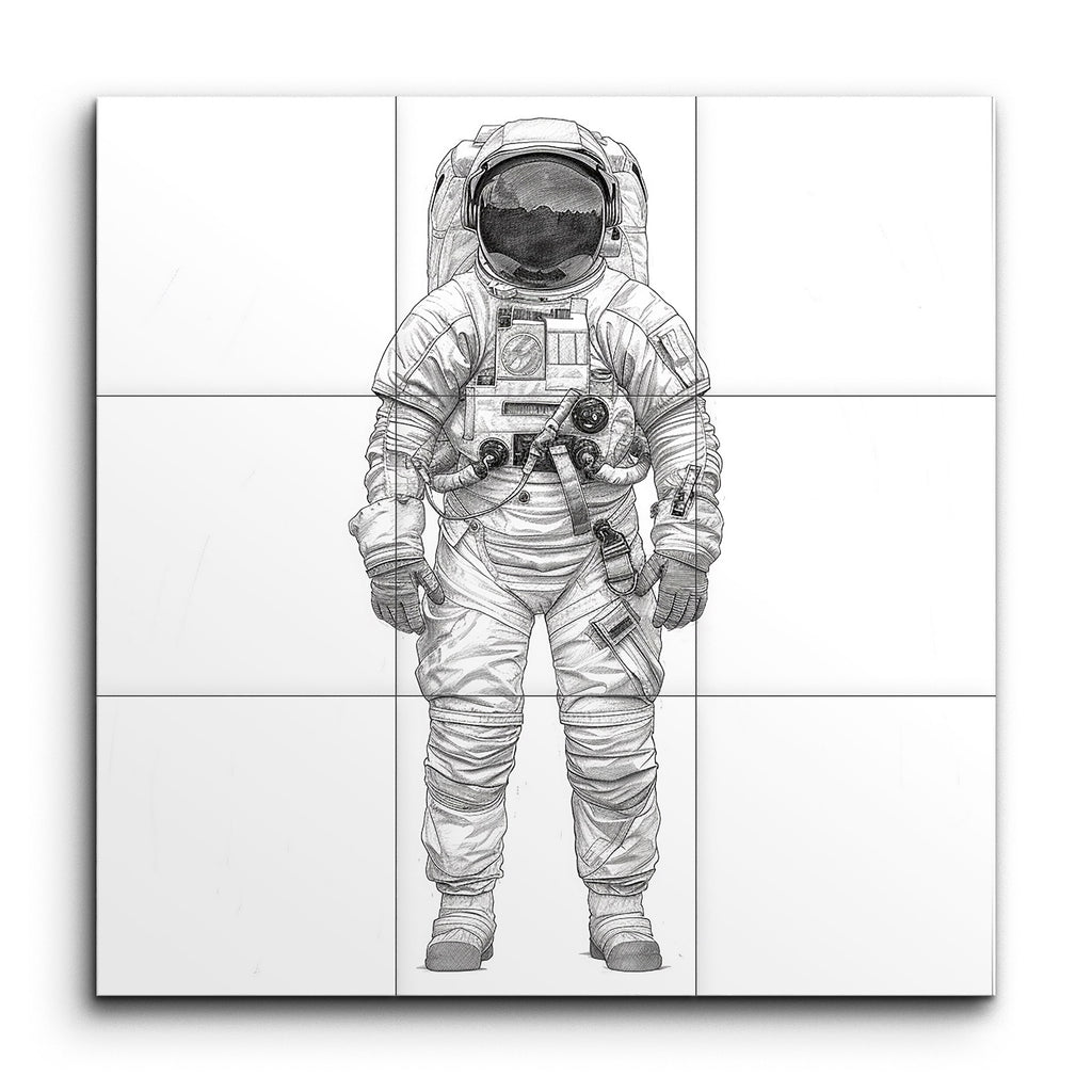 Immerse yourself in the captivating world of space exploration with this stunning tile mural. The artwork showcases a highly realistic, monochromatic illustration of an astronaut, meticulously detailed from helmet to boots. Every seam, fold, and piece of equipment is rendered with precision, bringing the space suit to life. The centered composition and intricate line work create a lifelike depth, making this mural a striking tribute to the marvels of human ingenuity and the vastness of outer space.