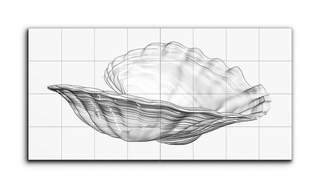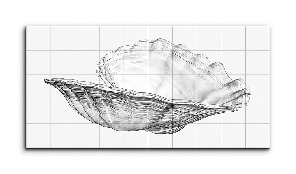 This artwork features a detailed and intricate line drawing of an open clam shell, rendered in a monochromatic palette of black and white. The delicate and precise lines capture the organic, flowing contours and textures of the shell, shown from a slightly angled perspective to enhance its three-dimensional appearance. Meticulous illustrations of the ridges and grooves emphasize the natural patterns and structure, offering a minimalistic yet highly detailed focus on form and texture.