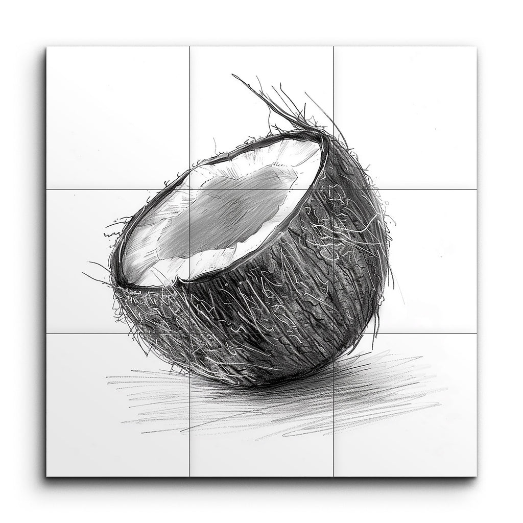 This tile mural features a meticulously detailed sketch of a halved coconut. The monochromatic artwork uses shades of gray to create depth and texture. The rough, fibrous outer shell is illustrated with fine, jagged lines, while the inner white flesh and hollow center are rendered with careful shading for a three-dimensional effect. The combination of cross-hatching and smooth shading techniques adds realism, and subtle horizontal lines beneath the coconut suggest a shadow, grounding the object in space.
