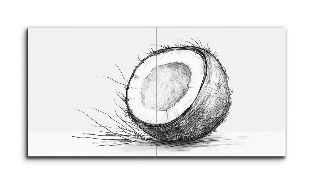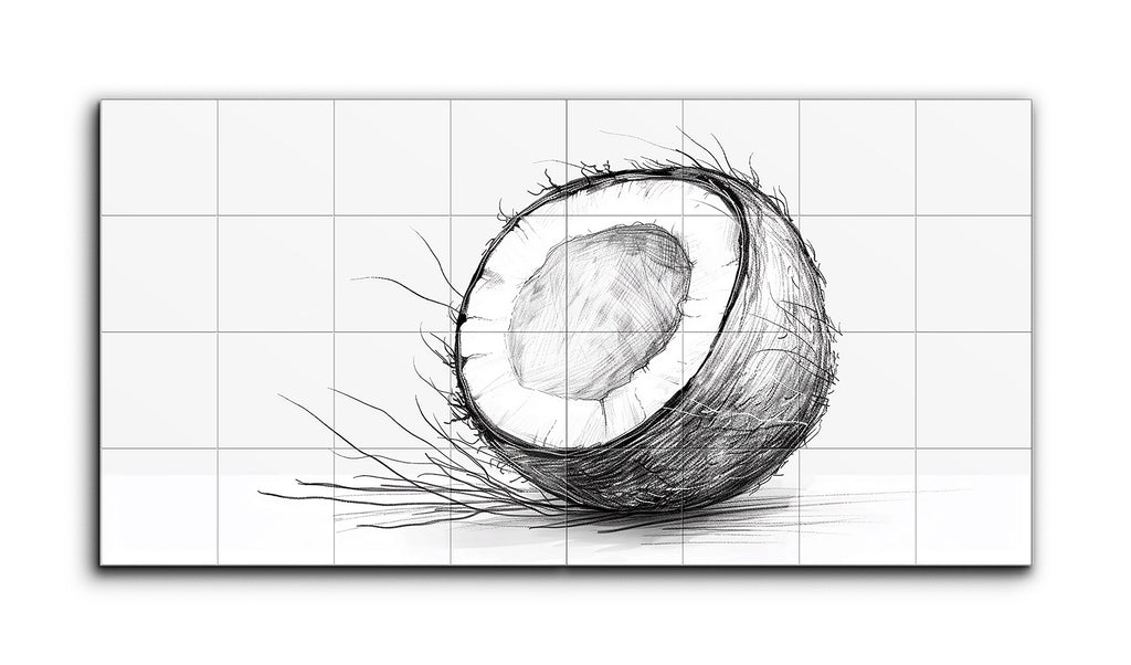 This tile mural features a meticulously detailed sketch of a halved coconut, rendered in monochromatic shades of black and grey. The outer shell is depicted with rough, fibrous textures, while the inner flesh showcases a smoother, cross-hatched shading for a three-dimensional effect. Strands of fibrous material extend from the shell, enhancing the realism. Positioned slightly off-center against a minimalistic background, the artwork's fine line work and varied weights create a striking, realistic portrayal.