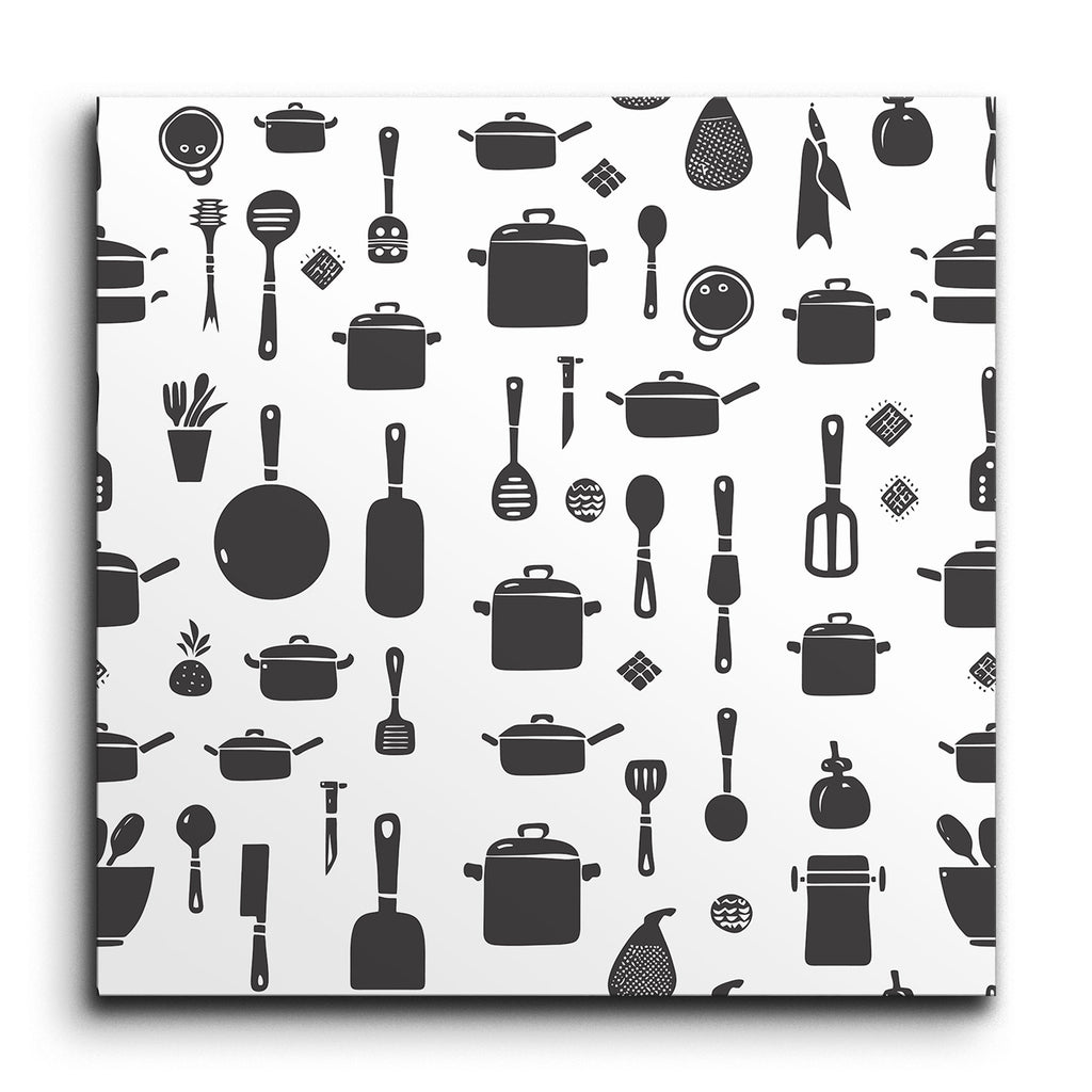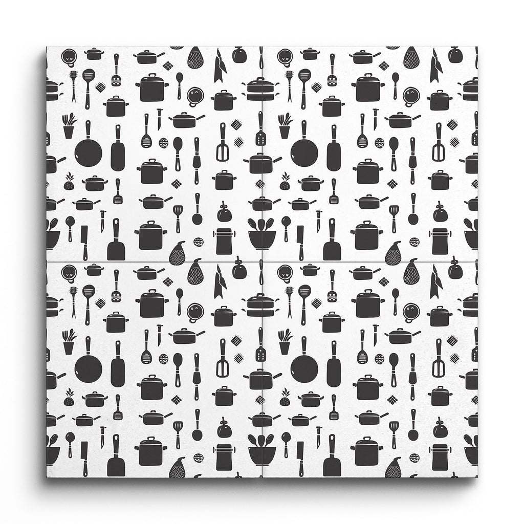 Discover a decor tile that seamlessly blends function with modern artistry. This tile showcases a striking monochromatic design, set against a crisp white backdrop. Bold black silhouettes of kitchen essentials, from pots and pans to knives and spoons, create a dynamic yet orderly pattern. The repetition of these sleek, straightforward shapes brings a touch of contemporary elegance to any space, making it an ideal choice for those who appreciate clean lines and minimalist beauty.