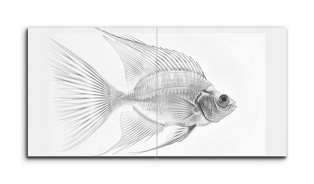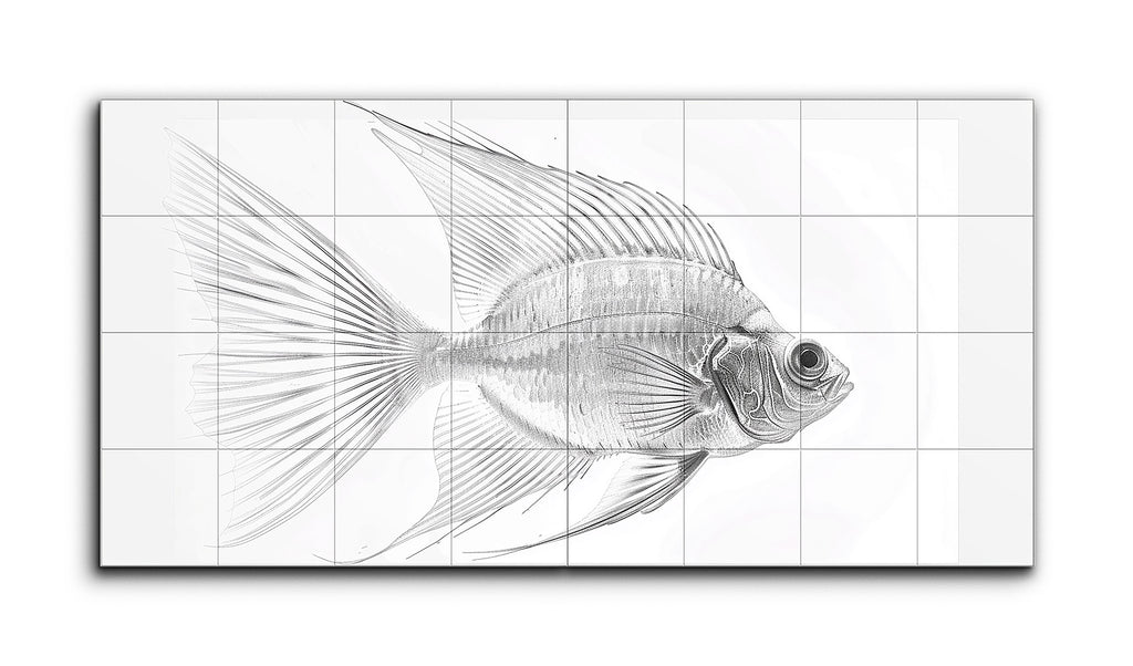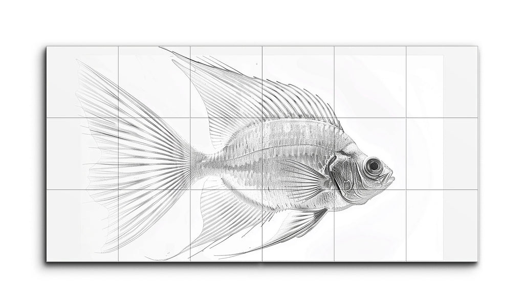 This tile mural captures a monochromatic illustration of a fish with exceptional precision. Every aspect of the fish's anatomy is intricately detailed, from the elongated, delicate fins to the meticulously rendered scales. Subtle shading gives the body a three-dimensional effect, while the head features finely drawn eyes and gills. Reminiscent of scientific illustrations, this grayscale artwork emphasizes accuracy and detail, offering a classic, timeless appeal.