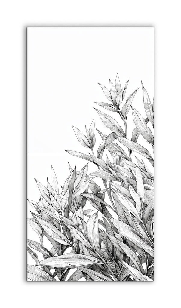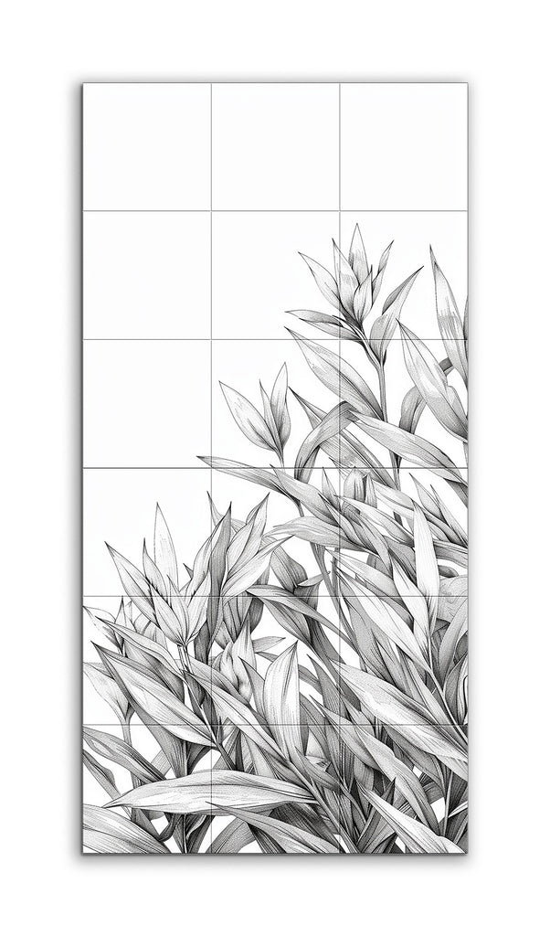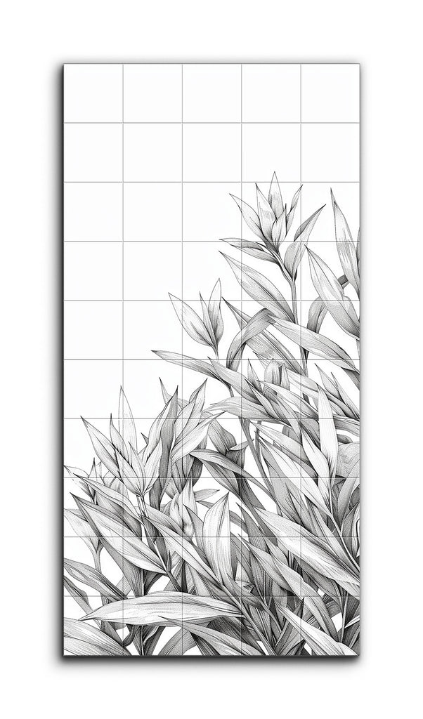 This tile mural features a highly detailed and intricate illustration of foliage. Rendered in a monochromatic palette of black and white, the artwork showcases meticulously drawn leaves with fine lines and textures. Each leaf is depicted with realistic veins and natural curves, creating a sense of depth and dimension. The overlapping and intertwining leaves form a dense, lush composition, emphasizing clean, minimalistic aesthetics with a strong focus on line work and shading to highlight the natural beauty and complexity of the foliage.