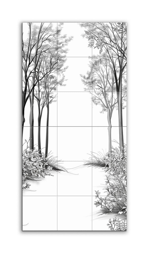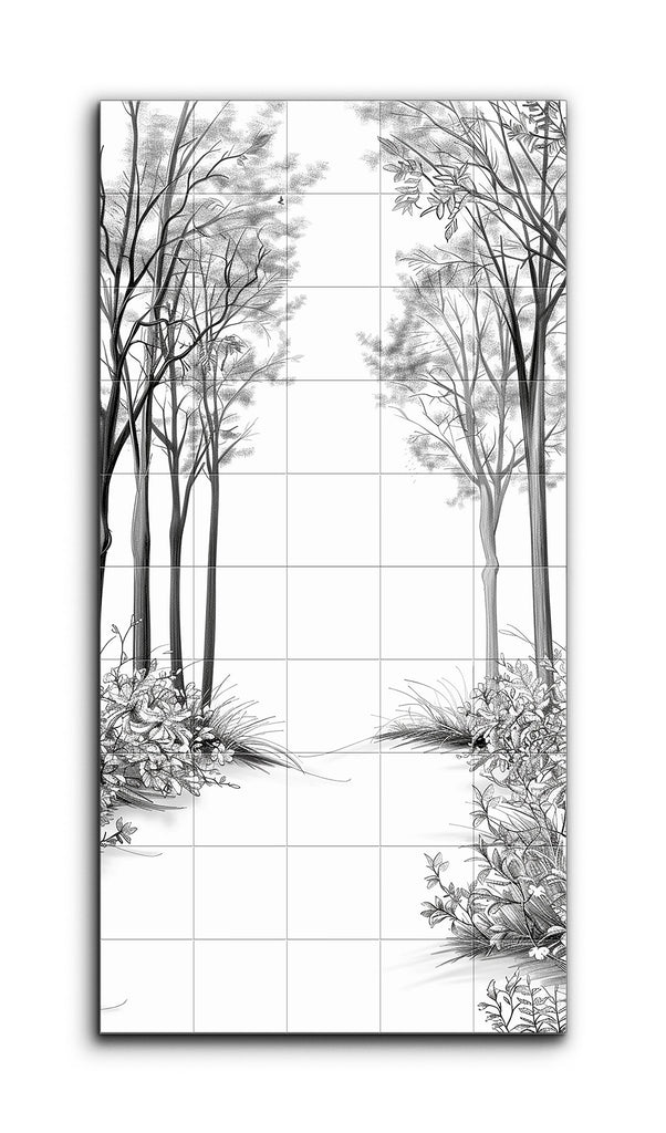 This tile mural showcases a serene forest scene rendered in a monochromatic palette of black, white, and gray. Tall, slender trees with intricate branches form a canopy at the top, their bark detailed with fine lines and subtle shading. The foreground is rich with meticulously illustrated foliage and underbrush, capturing the natural flow and intricate patterns of leaves. A central pathway devoid of human presence guides the viewer into the tranquil forest, emphasizing the scene's calm and peaceful nature. The detailed, realistic style and monochromatic scheme lend a timeless, classic feel to this beautiful depiction of nature's serenity.