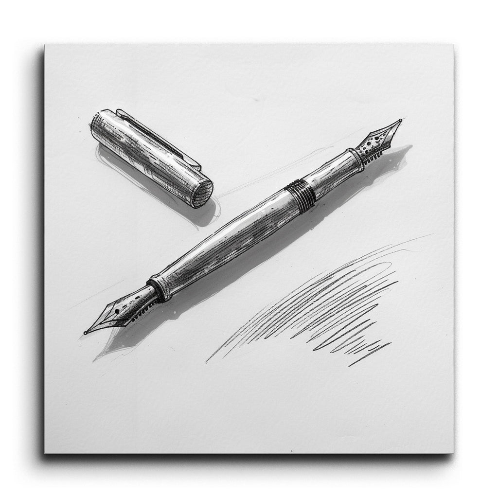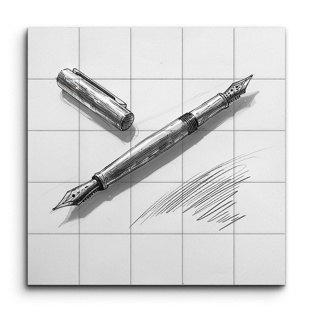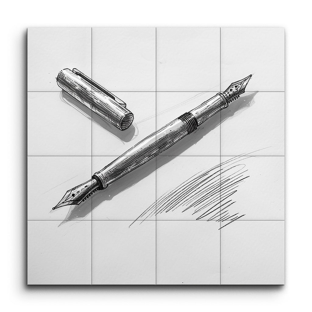 This tile mural captures the essence of craftsmanship with a meticulously detailed sketch of a fountain pen and its cap. Rendered in a monochromatic style, the pen's metallic texture and intricate design elements, from the nib to the grip section, are brought to life through precise cross-hatching and line work. The cap, equally detailed, sits separately, while a few ink scribbles below showcase the pen’s flow. This artwork, reminiscent of technical illustrations, celebrates precision and artistry.