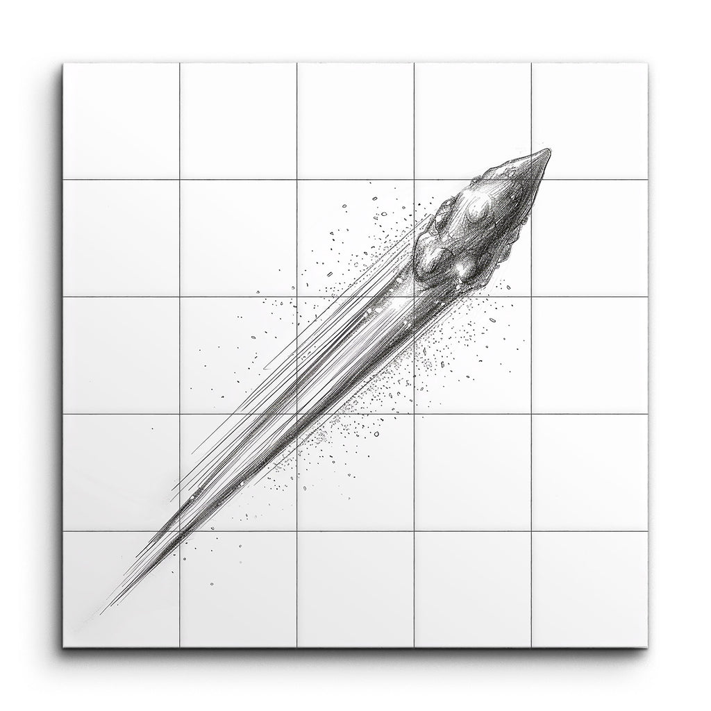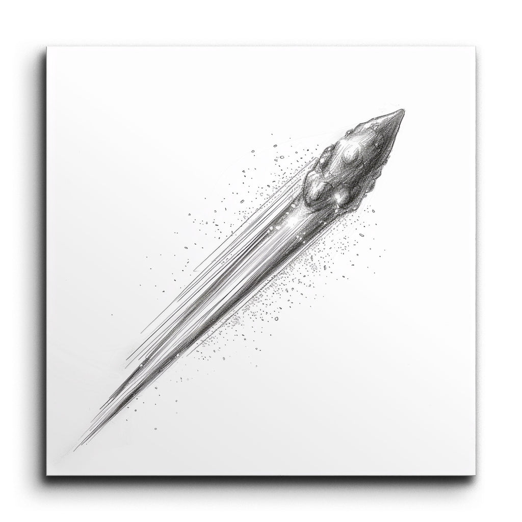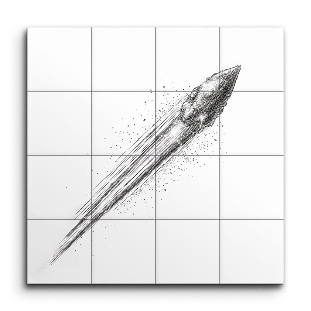 This tile mural showcases a dynamic, elongated object resembling a futuristic spaceship or rocket, rendered in a monochromatic pencil-sketch style. The artwork emphasizes fine lines and shading to create depth and texture, with a pointed front and tapered back suggesting motion and speed. Subtle surface details and scattered dots and lines enhance the sense of movement and energy, while the minimalist techniques and meticulous line work convey a polished, futuristic aesthetic.