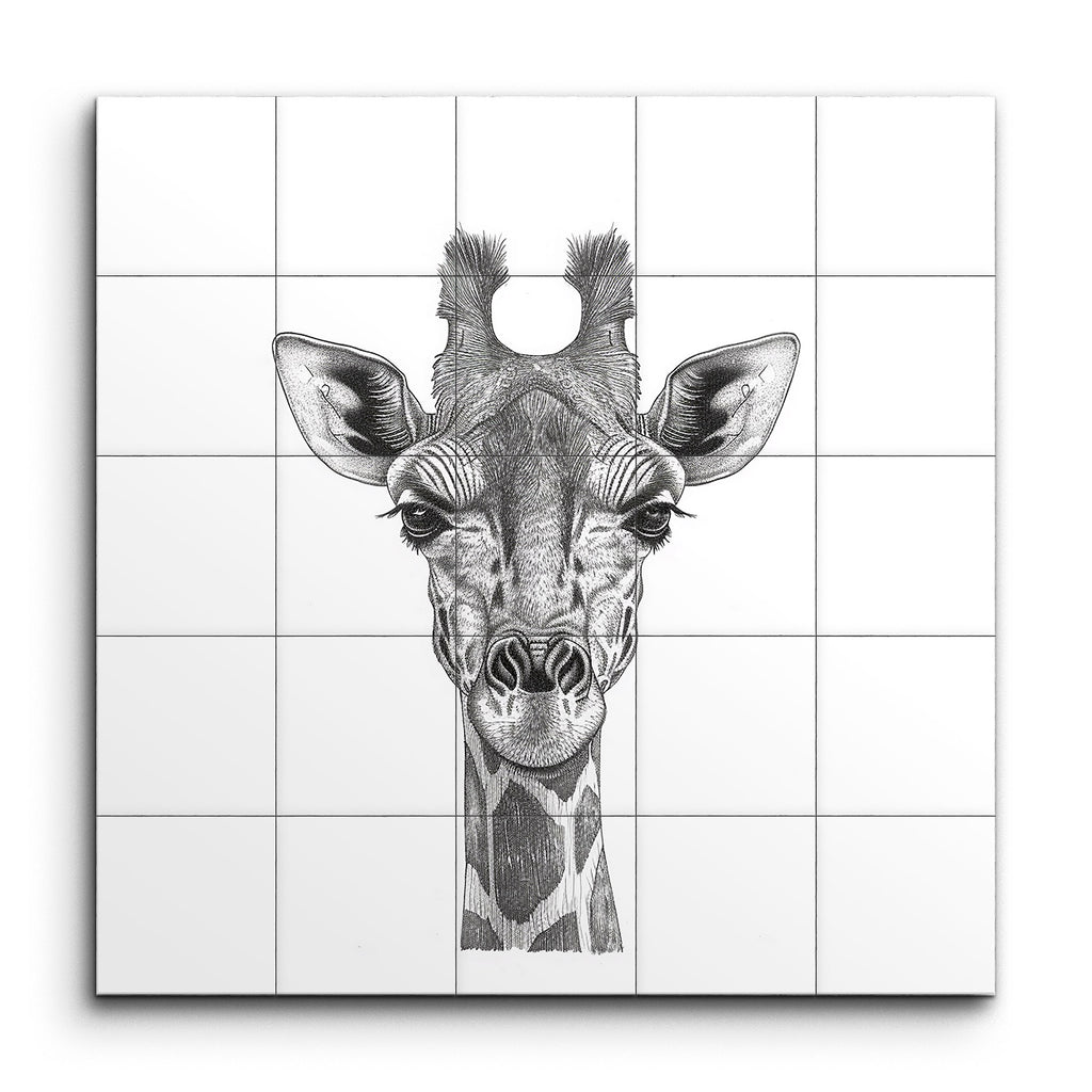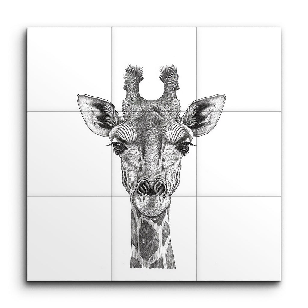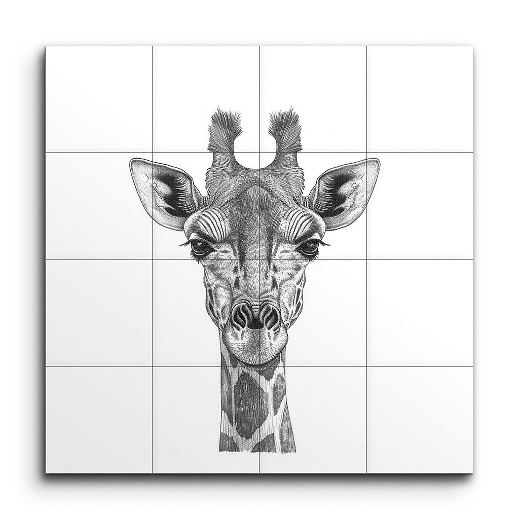 Adorn your space with an exquisite tile mural featuring a highly detailed, monochromatic illustration of a giraffe's head and upper neck. This lifelike artwork, rendered with intricate line work and shading, captures the natural textures and patterns of the giraffe's skin and fur. The giraffe's prominent facial features and distinctive ossicones are depicted with precision, creating a three-dimensional effect. Centered and symmetrical, this piece brings a harmonious and visually captivating focal point to any room.