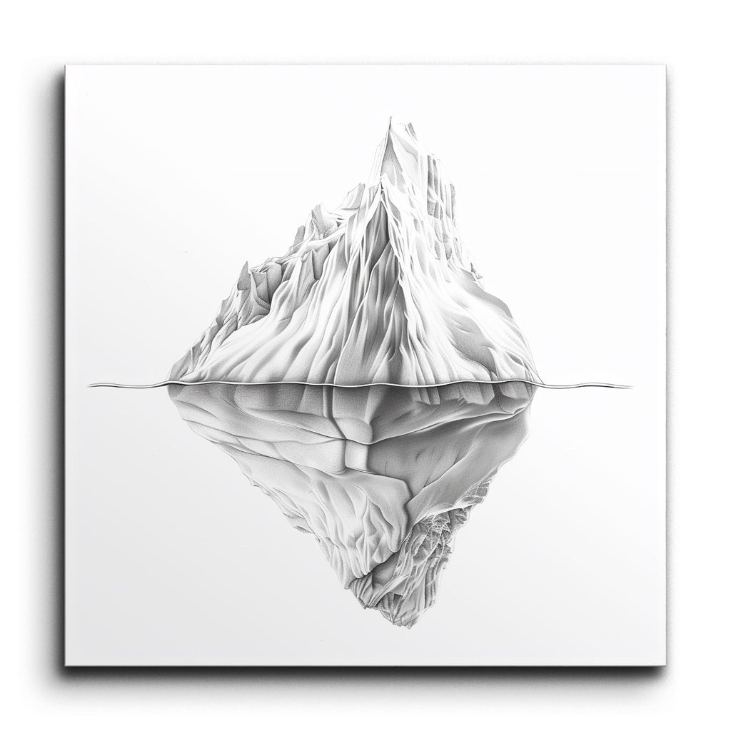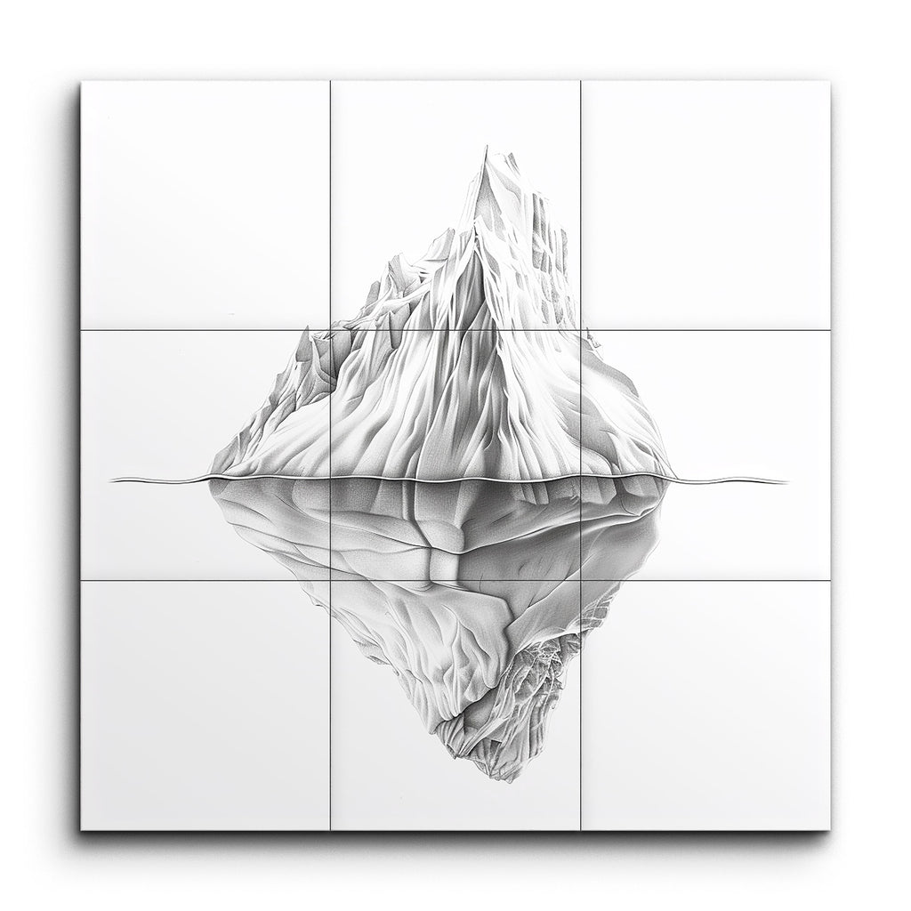 This captivating tile mural features a minimalist, monochromatic depiction of an iceberg, showcasing its striking duality. Above the waterline, jagged and angular edges convey a rugged, imposing presence, while below, smooth, flowing lines evoke depth and mass. The symmetrical reflection adds balance, emphasizing the iceberg's hidden and visible facets. Grayscale tones and precise light and shadow interplay enhance the ethereal quality, creating a visually arresting and thought-provoking piece.