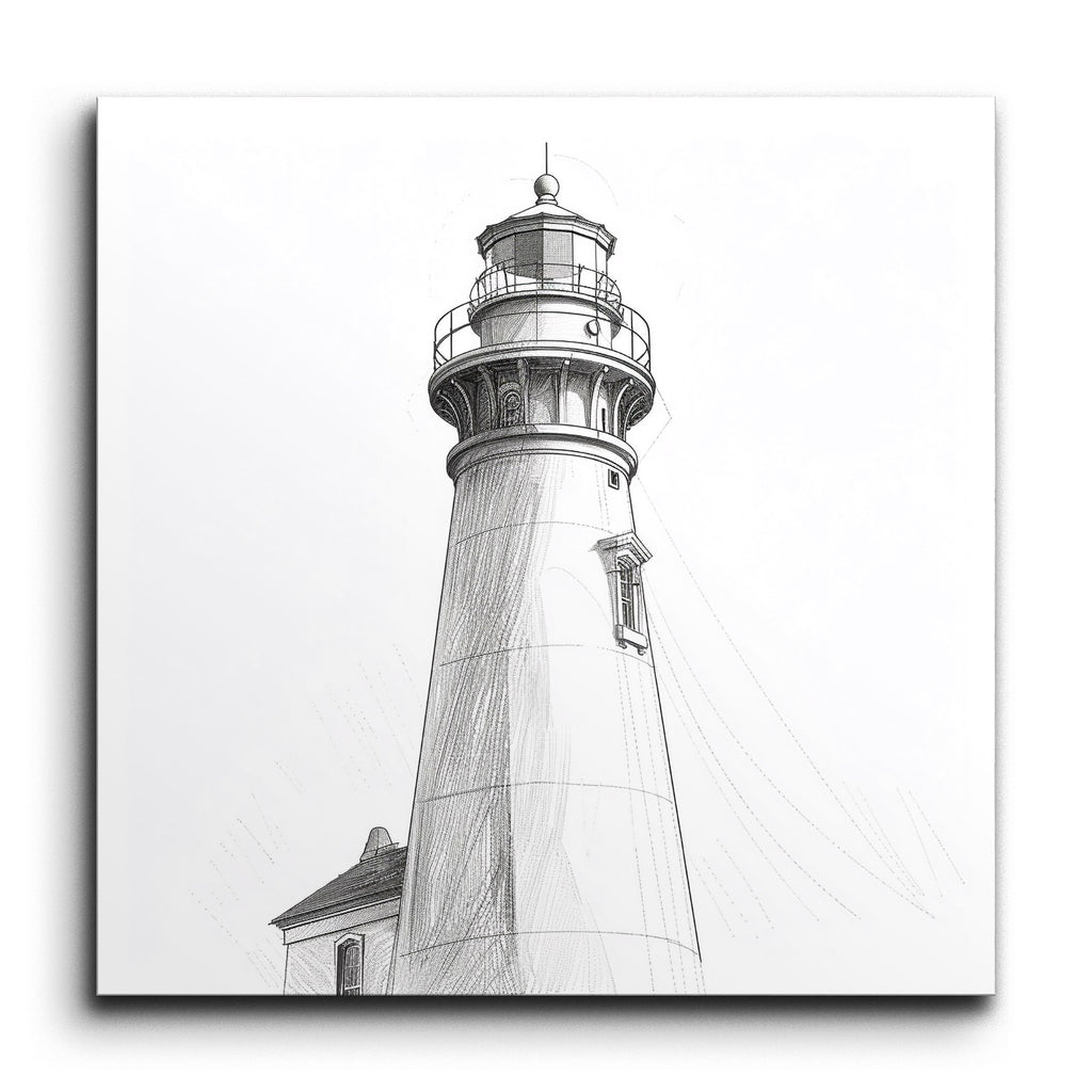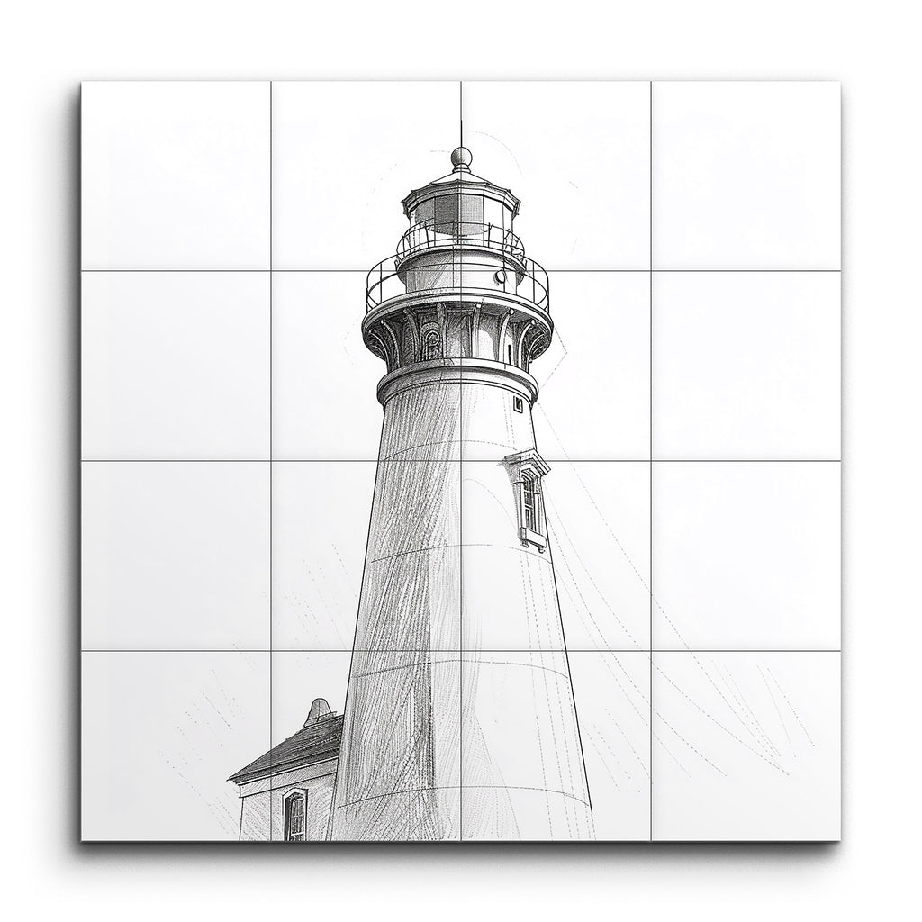 Illuminate your space with this stunning tile mural, featuring a meticulously detailed, monochromatic line drawing of a lighthouse. The realistic depiction, with its fine, precise lines and intricate architectural details, captures the grandeur and elegance of this coastal beacon. The artist's skillful use of cross-hatching and perspective adds depth and dimension, making you feel as if you are gazing up at the towering structure. This artwork is a timeless tribute to nautical beauty and craftsmanship.