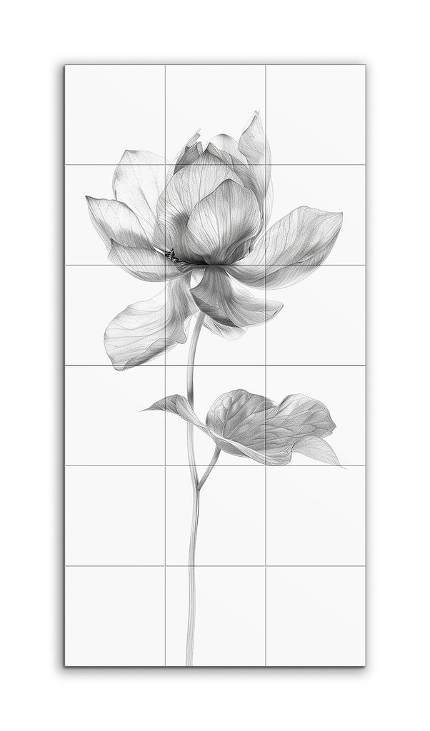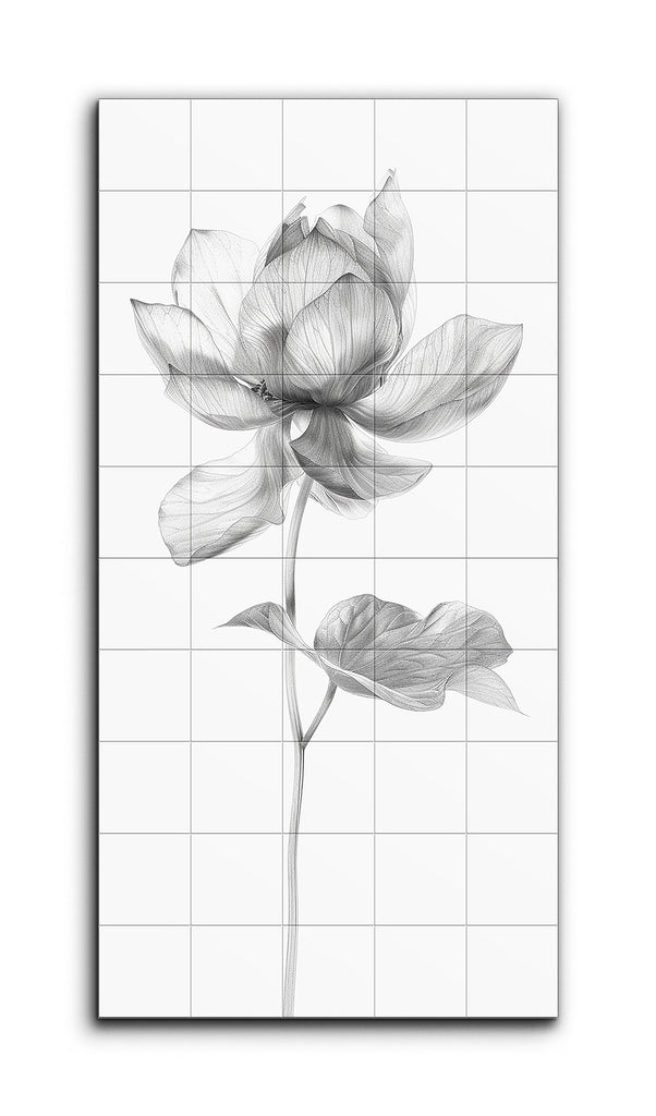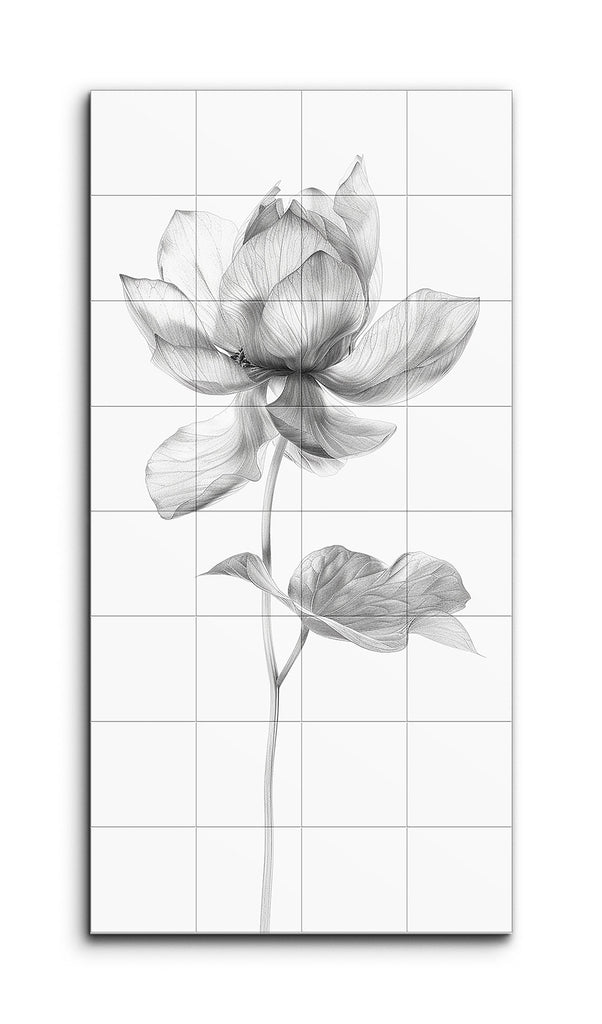 This tile mural showcases a meticulously crafted monochromatic drawing of a lotus flower, rendered with exceptional detail. The artwork captures the delicate petals with soft, flowing lines, creating a sense of lightness and translucency. Subtle shading enhances the three-dimensional effect, highlighting the natural curves and textures of the flower. The slender, slightly curved stem leads to a finely shaded leaf with visible veins, adding to the realism. The balanced composition and botanical illustration style offer a timeless, elegant piece.
