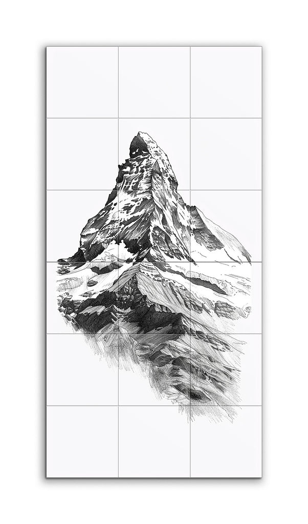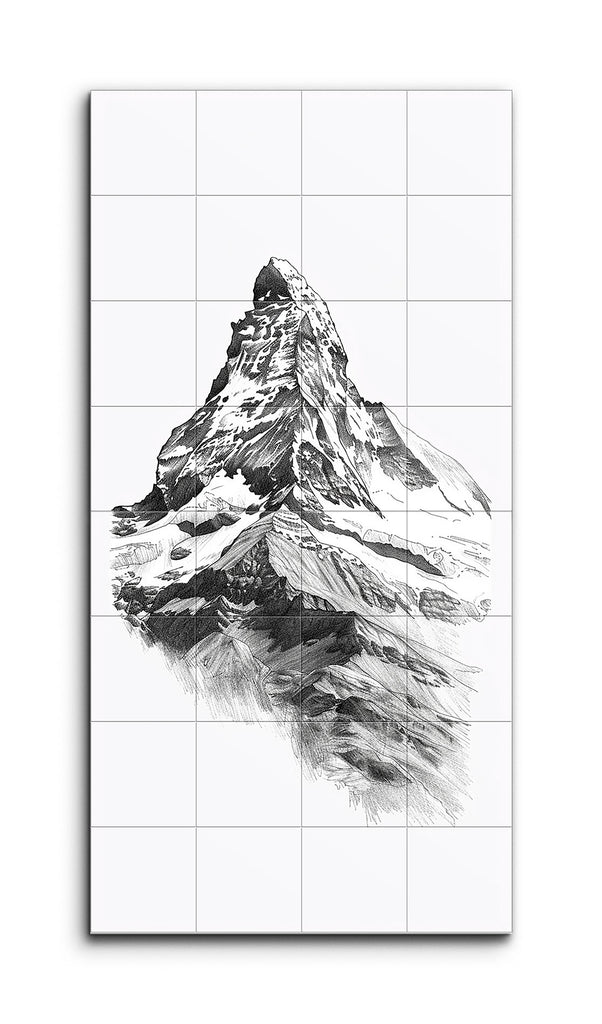 This tile mural showcases a meticulously detailed and realistic depiction of a mountain, likely inspired by the iconic Matterhorn. Rendered in black and white, the artwork features sharp, jagged peaks and rugged terrain brought to life through fine lines and cross-hatching. The shading masterfully captures light and shadow, giving the mountain a three-dimensional feel. Below, an abstract reflection in water contrasts with the detailed mountain, adding a dynamic element. The monochrome palette enhances the mountain's dramatic and intricate beauty.