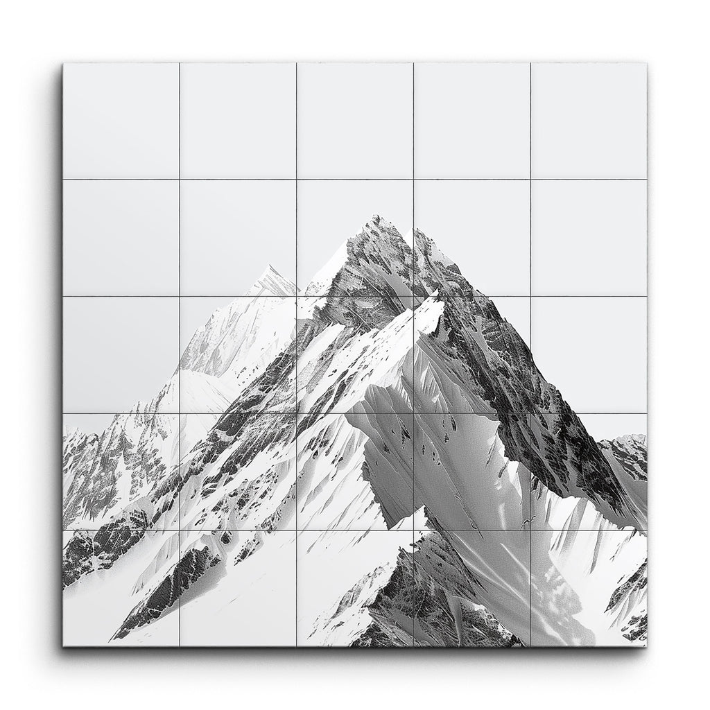 Discover the essence of nature's grandeur with our minimalist tile mural, featuring a striking black and white depiction of a mountain range. The central peak, sharply defined and intricately detailed, commands attention with its rugged texture and steep inclines. Expertly rendered light and shadow accentuate the mountain's contours, creating a captivating three-dimensional effect. Surrounding, subtler peaks add depth, enhancing the scene's majesty and solitude. This modern, clean composition evokes awe and tranquility, perfect for any space.