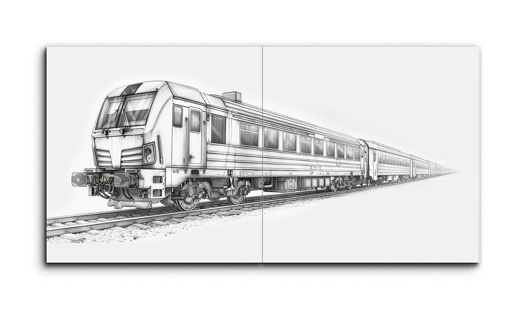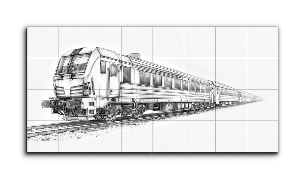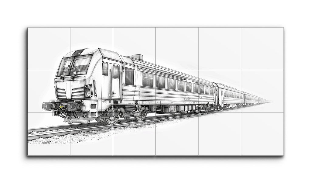 This tile mural showcases a detailed illustration of a modern train, rendered in a realistic and technical style. The train is depicted from a three-quarter perspective, highlighting both the front and the length as it recedes into the distance. Monochromatic shades of gray create depth and dimension, with intricate line work emphasizing the train's components, such as headlights, windows, and the coupling mechanism. The sleek, streamlined body and meticulously detailed wheels and undercarriage contribute to the polished, metallic appearance. The tracks beneath are precisely drawn, adding to the overall realism. The artwork masterfully combines technical precision with artistic skill, offering a visually engaging depiction of a modern train.