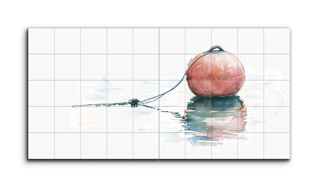 This diptych tile mural features a weathered buoy, its faded red or orange hue suggesting years of exposure to the elements. Floating above a reflective water surface, the buoy is rendered in a watercolor style, with translucent, fluid strokes that blend soft edges and muted colors. Hints of blues, pinks, and oranges create a serene, melancholic atmosphere. The composition, balanced with the buoy off-center, evokes solitude and calmness, inviting contemplation of isolation, time's passage, and the beauty in simplicity.