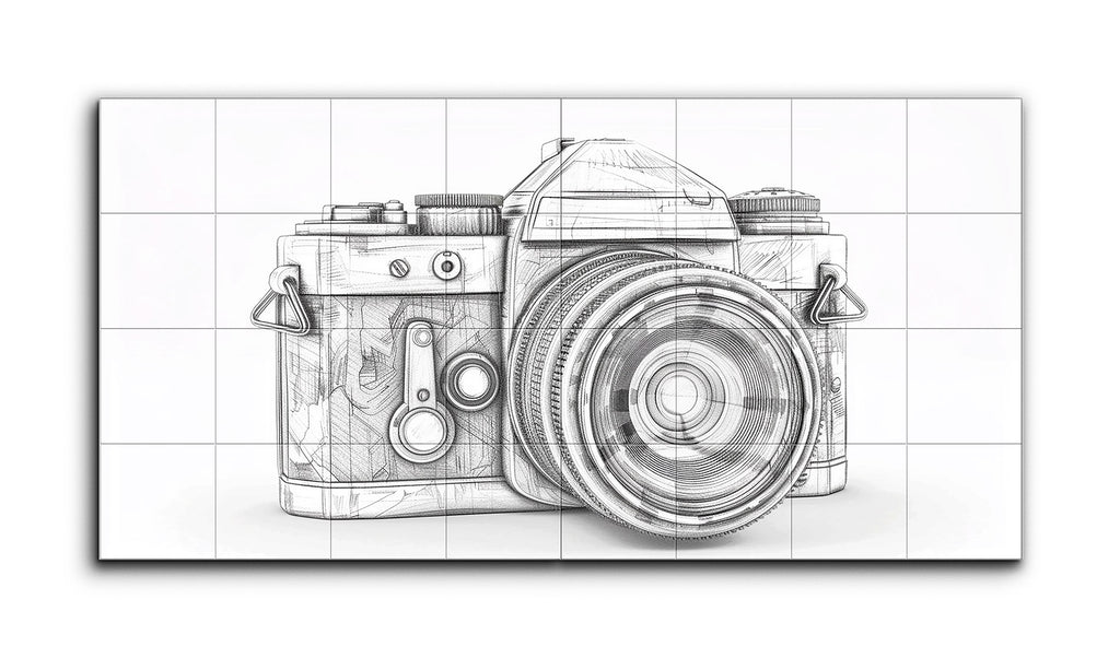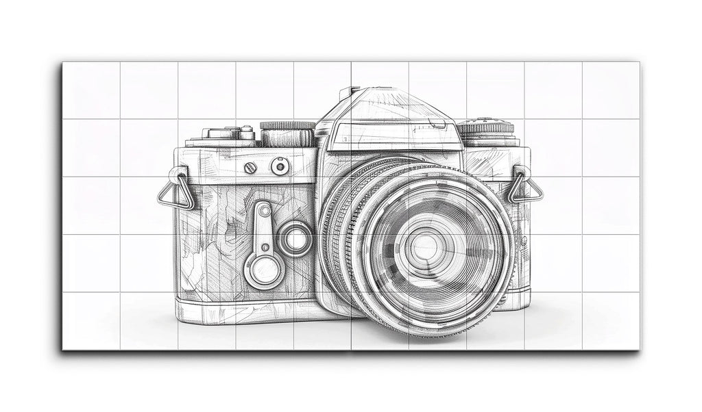 This tile mural features a meticulously detailed line drawing of a vintage camera, rendered in black and white. The illustration, viewed from a frontal perspective, highlights the camera's lens at the center. The technical, schematic style, with its clean, precise lines and varied strokes, resembles an engineering blueprint. Cross-hatching and parallel lines add depth and texture, giving the camera a three-dimensional feel. The minimalist, modern aesthetic emphasizes technical accuracy and detailed representation.