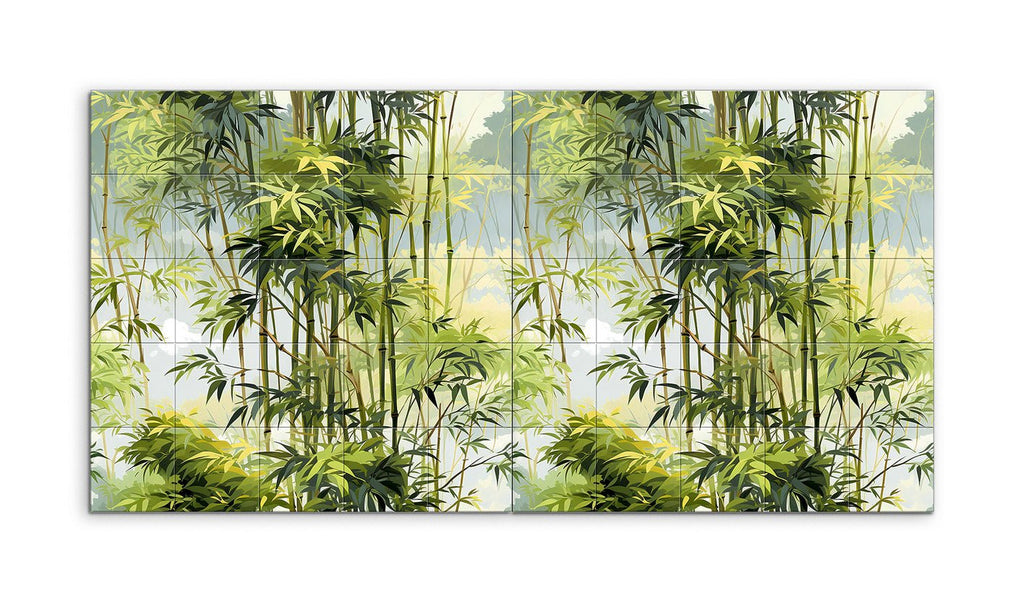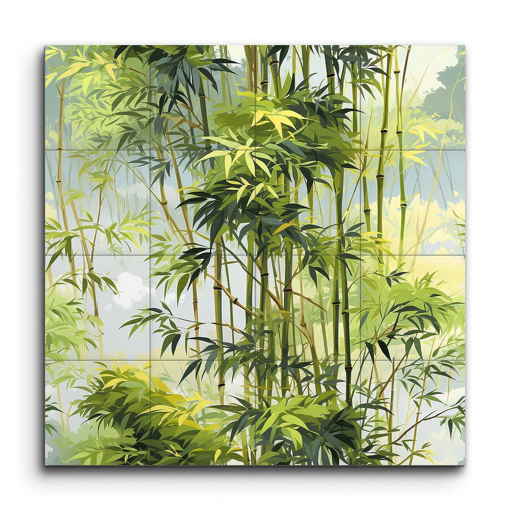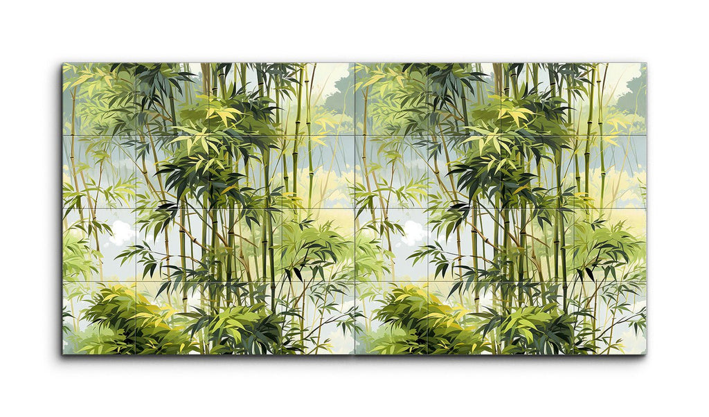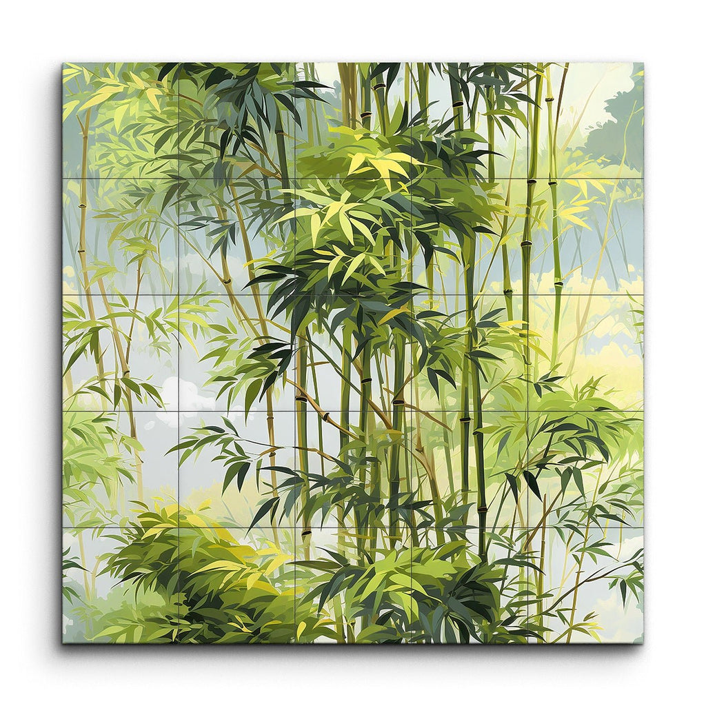 Immerse your space in tranquility with this stunning tile mural, featuring a dense cluster of bamboo plants rendered in exquisite detail. The tall, slender stalks exhibit varying shades of green, capturing the play of light and shadow, while the lush, layered leaves create a rich sense of depth and texture. A soft, muted sky with hints of clouds forms the serene backdrop, enhancing the natural beauty and elegance of the bamboo. This harmonious composition melds realism with a touch of stylized artistry, making it a captivating focal point for any room.