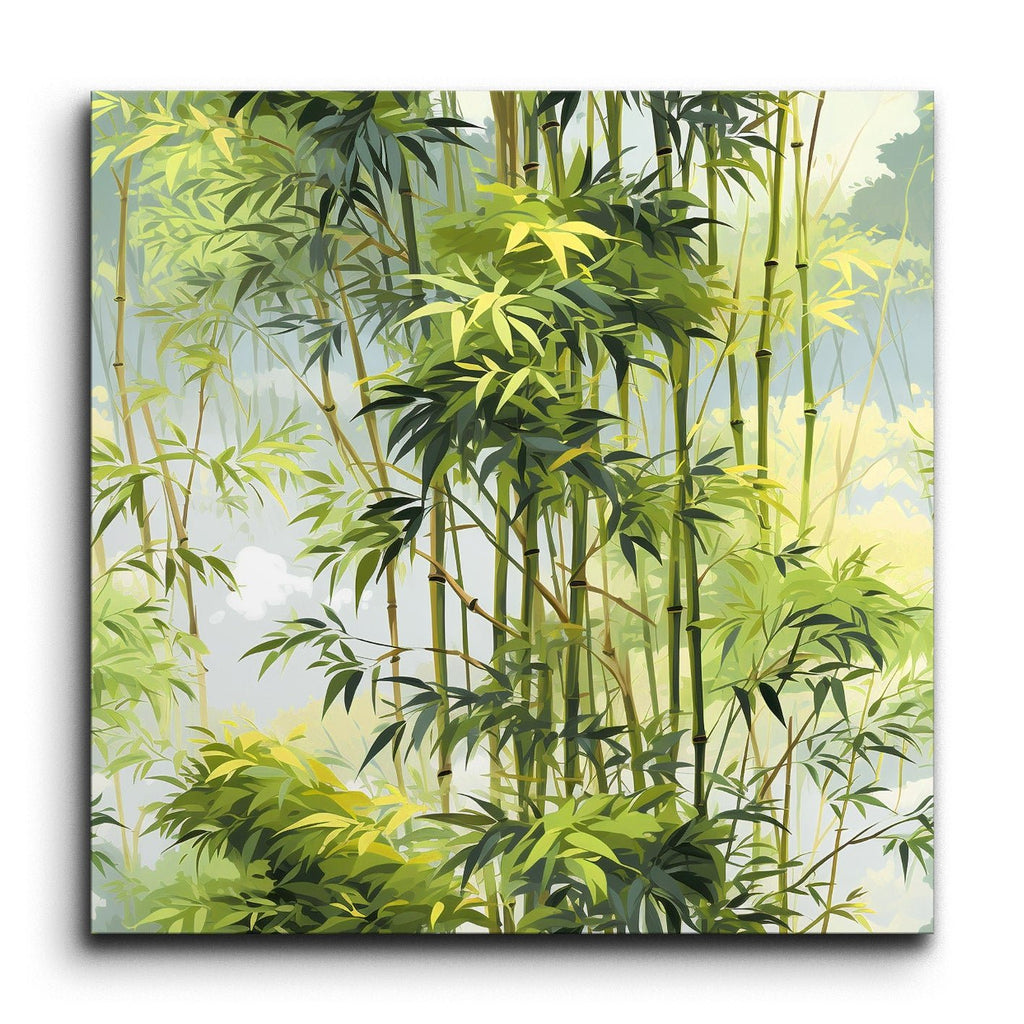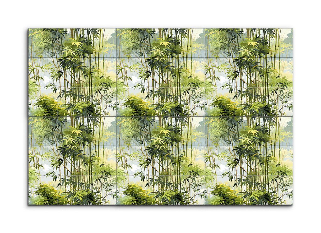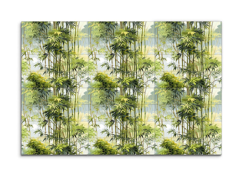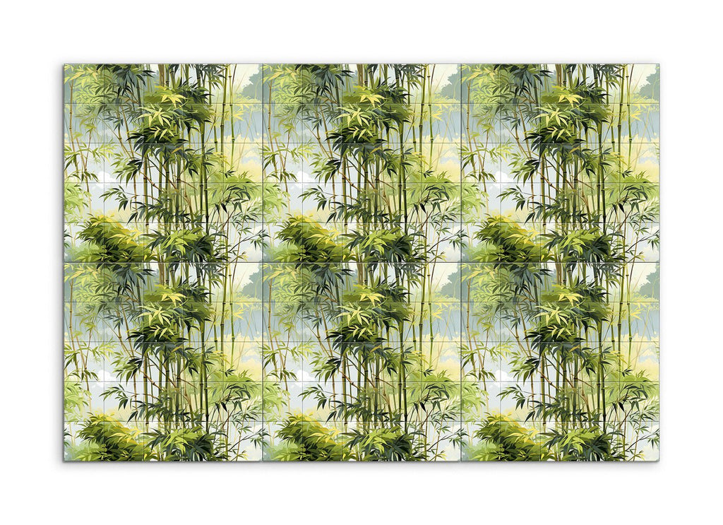 Immerse your space in tranquility with this stunning tile mural, featuring a dense cluster of bamboo plants rendered in exquisite detail. The tall, slender stalks exhibit varying shades of green, capturing the play of light and shadow, while the lush, layered leaves create a rich sense of depth and texture. A soft, muted sky with hints of clouds forms the serene backdrop, enhancing the natural beauty and elegance of the bamboo. This harmonious composition melds realism with a touch of stylized artistry, making it a captivating focal point for any room.