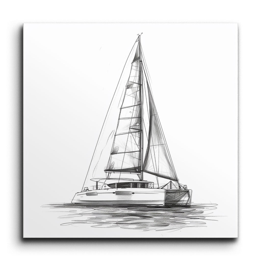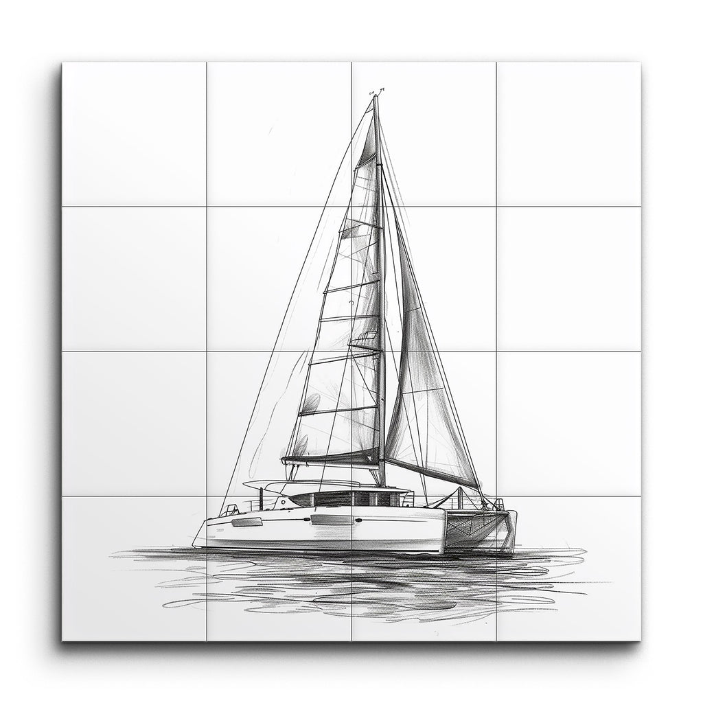 This exquisite tile mural features a meticulously detailed sketch of a catamaran sailboat, rendered in black and white. Capturing a frontal, slightly angled view, the artwork showcases the twin hulls and expansive sail with remarkable precision. The fine lines and shading bring depth and realism, highlighting the intricate rigging, the tension in the sail, and the smooth, streamlined hulls. The calm water beneath, suggested by subtle horizontal lines, completes this lifelike and dynamic portrayal.