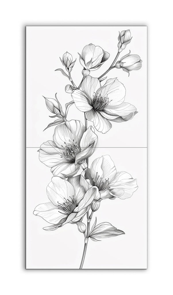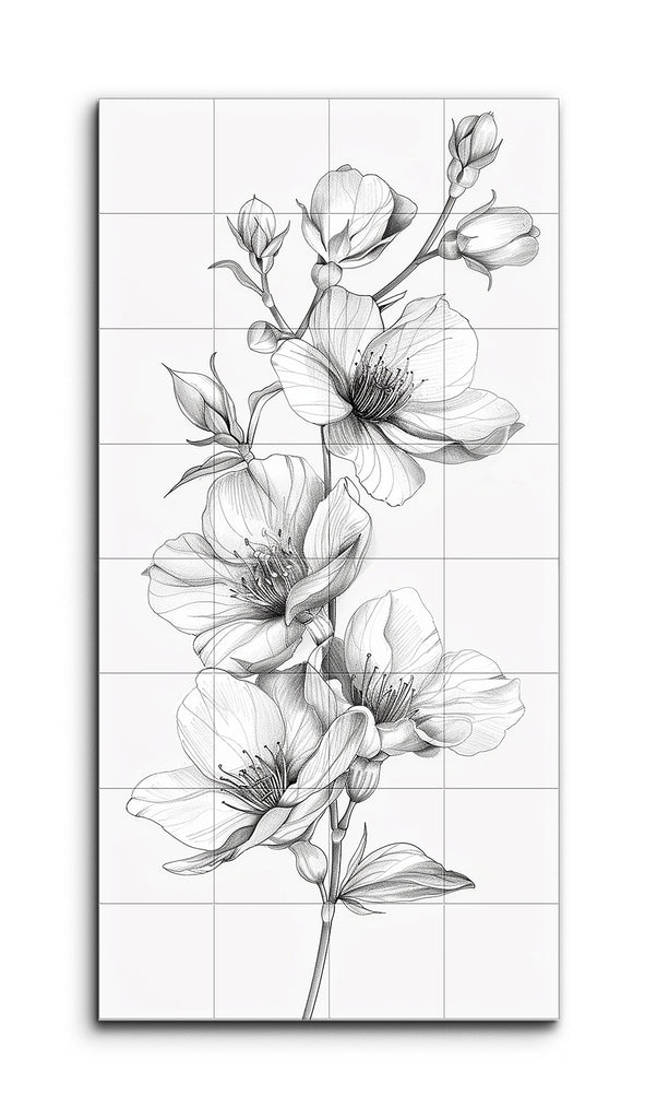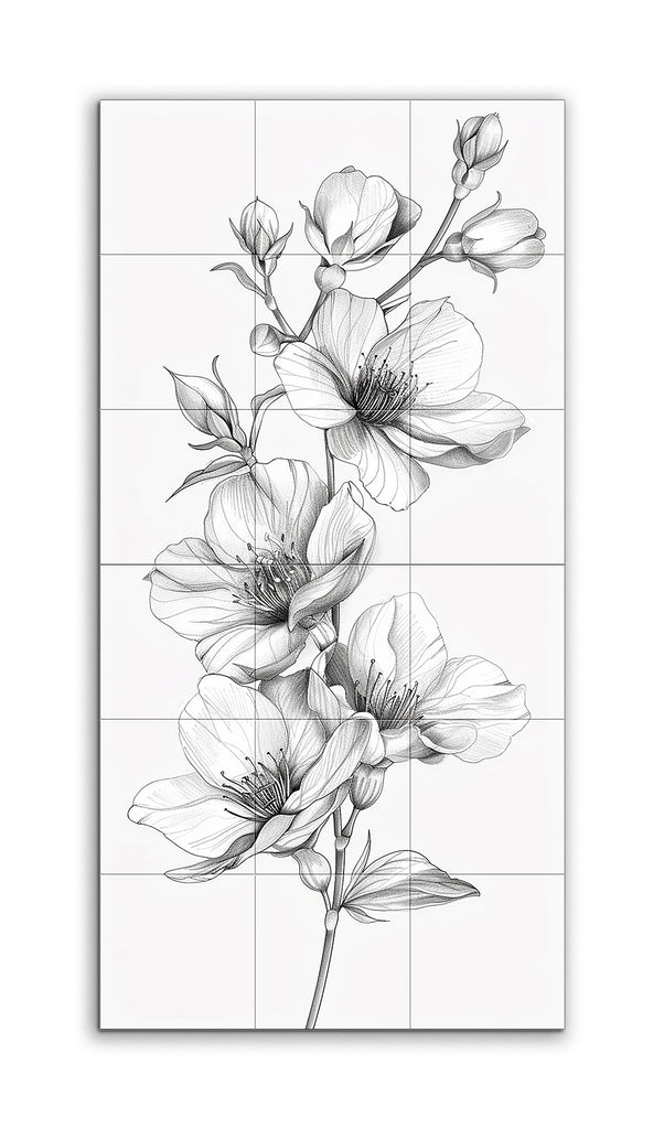 This tile mural features a detailed black and white illustration of a flowering plant, showcasing several blossoms at various stages of bloom. Intricate line work reveals delicate petals, stamens, and pistils, with fine cross-hatching and stippling providing depth and texture. Reminiscent of botanical illustrations, the clean, crisp lines emphasize the natural beauty and structure of the flowers, capturing their intricate details with scientific accuracy and aesthetic elegance.