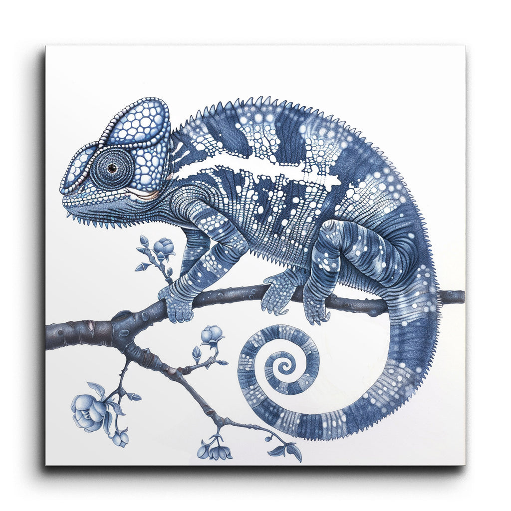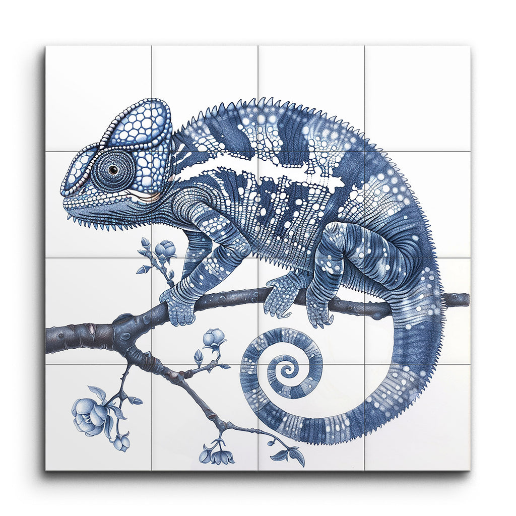 Immerse yourself in the mesmerizing world of our exquisite tile mural featuring a chameleon perched on a branch. Rendered in intricate detail, this artwork showcases the chameleon in striking shades of blue and white, adorned with a mesmerizing mosaic of dots and lines. The creature's eyes, with their concentric circles, convey a sense of focus and alertness, while its spiral tail adds a touch of whimsy. Delicate blossoms on the branch complement the scene, making this mural a captivating focal point for any space.