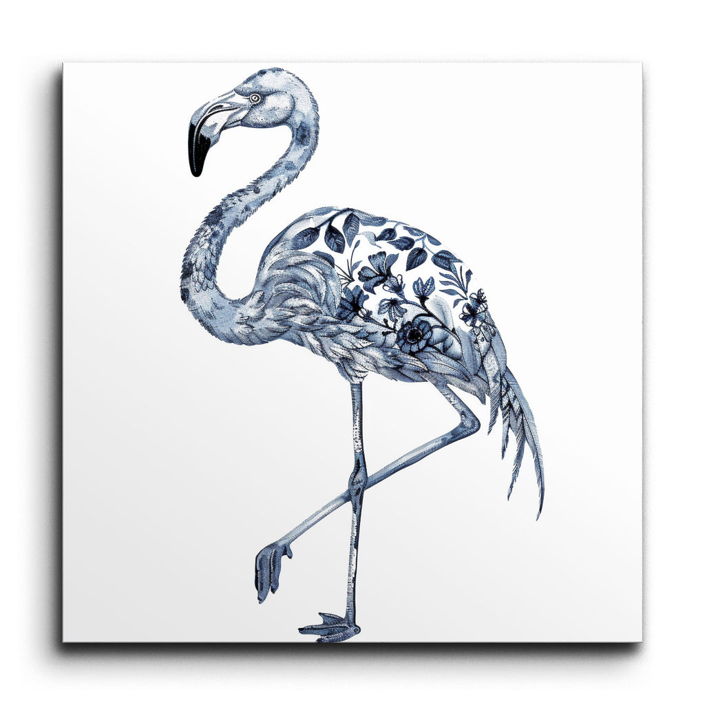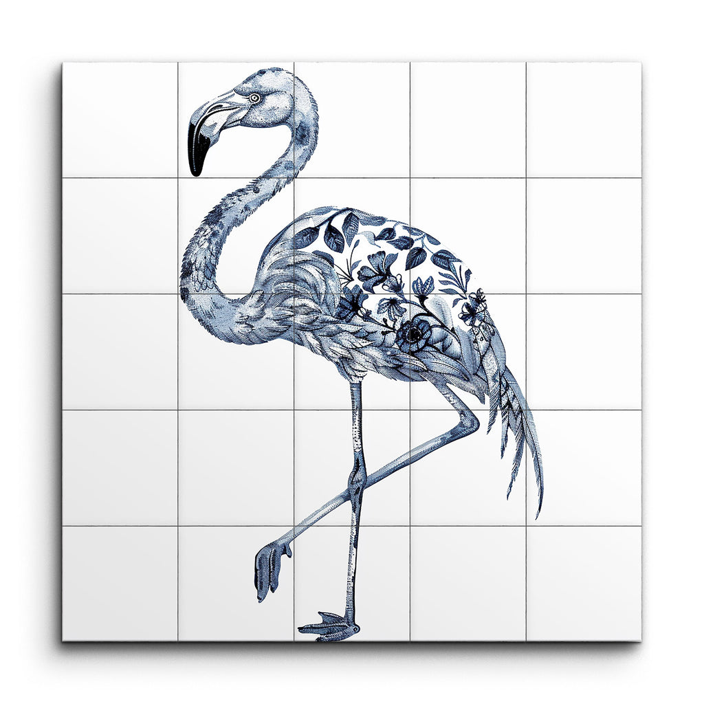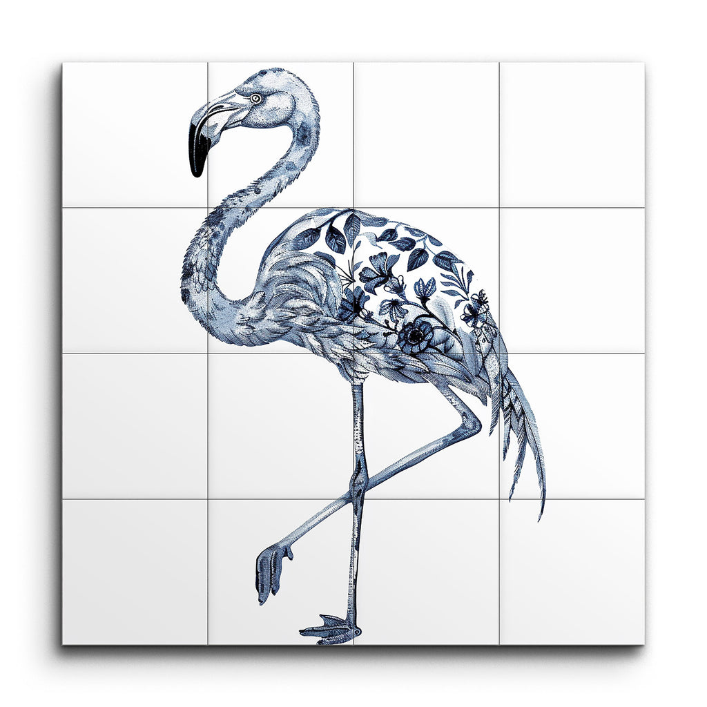 Transform your space with this exquisite tile mural featuring a detailed and intricate flamingo. Adorned with a harmonious blend of flowers and leaves, the flamingo is brought to life in shades of blue, creating a monochromatic elegance. Each petal and leaf is meticulously illustrated, enhancing the realistic depiction of the bird's feathers, legs, and beak. This artwork masterfully combines realism with decorative botanical motifs, offering a visually striking and aesthetically pleasing centerpiece for any setting.