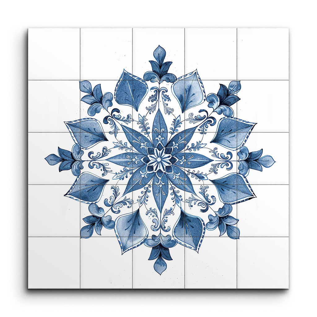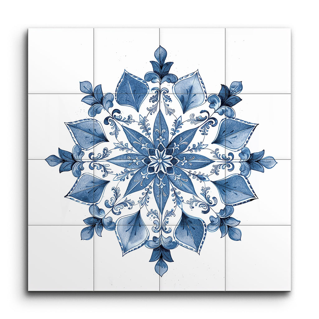 Transform your space with this mesmerizing tile mural featuring an intricately designed mandala in soothing shades of blue. The symmetrical radial pattern centers around a floral motif, with petals radiating outward, each adorned with delicate, swirling patterns. Surrounding layers of leaf-like shapes and additional floral elements are meticulously detailed, creating a sense of fullness and complexity. Evoking the elegance of traditional ceramic designs, this artwork brings a harmonious and meditative aesthetic to any setting.