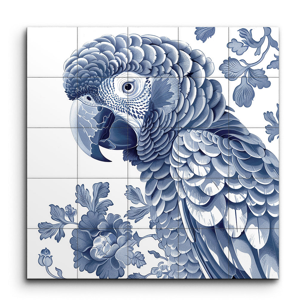 Immerse your space in elegance with this stunning tile mural, featuring a detailed illustration of a parrot in shades of blue and white. The parrot's intricate feathers and expressive features are masterfully rendered, creating a lifelike and captivating focal point. Complemented by a background of stylized flowers and leaves, this artwork echoes the timeless beauty of traditional blue and white porcelain designs. Its refined detailing and harmonious palette bring a sophisticated touch to any setting.
