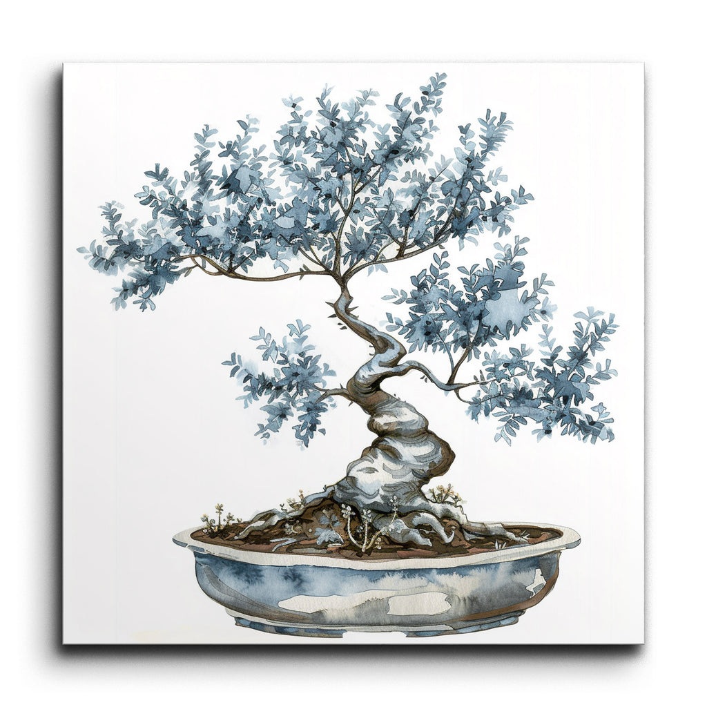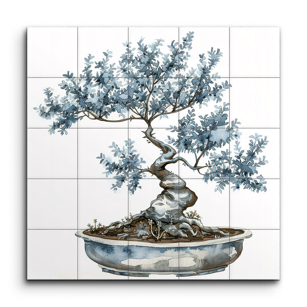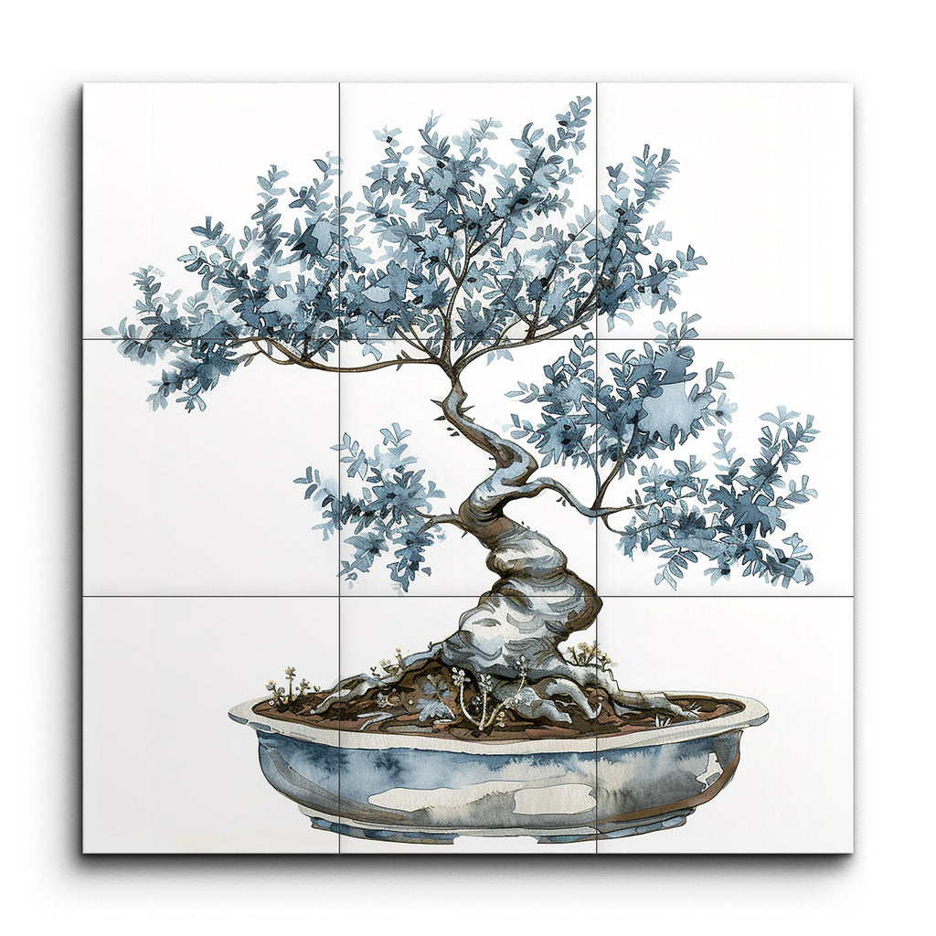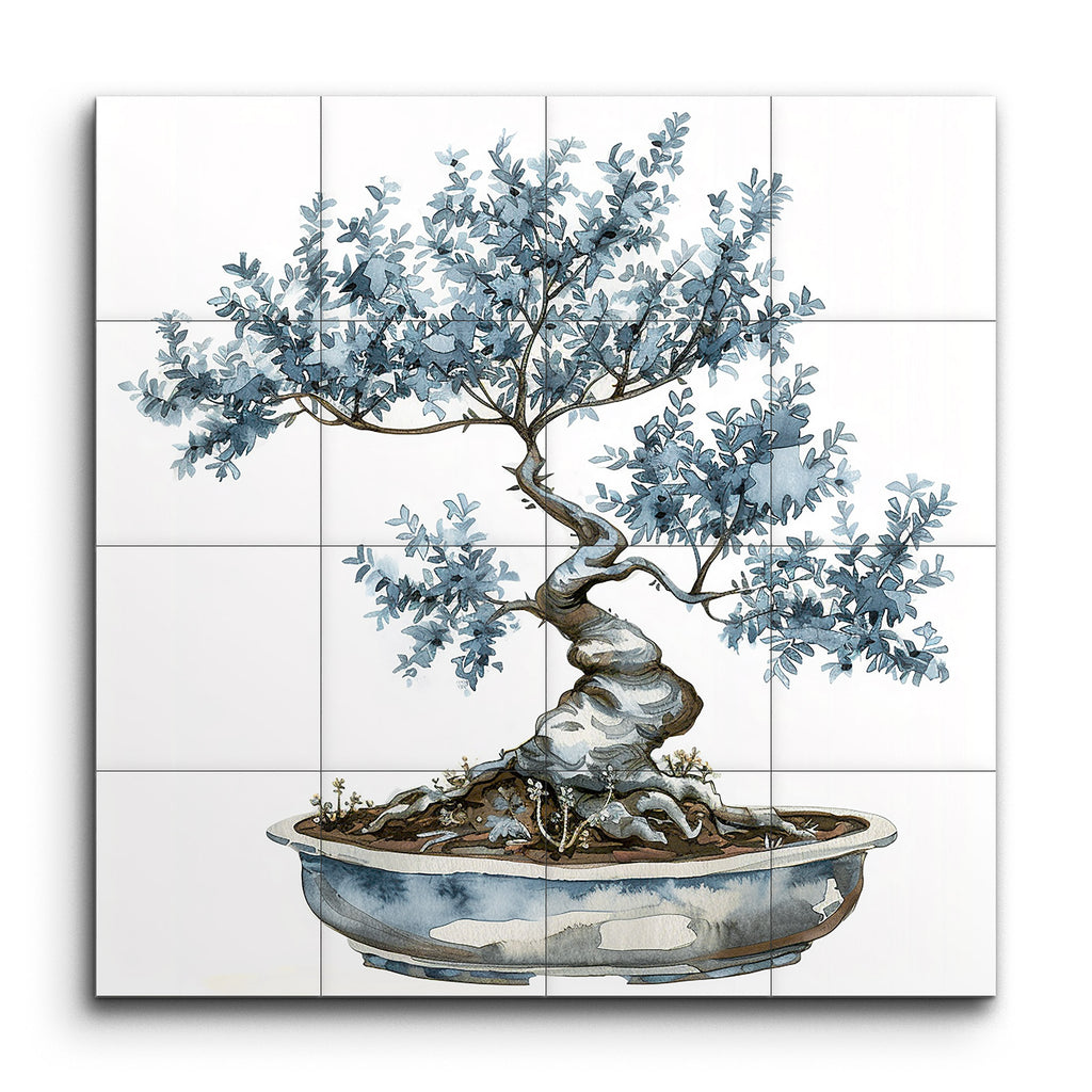 Transform your space with this captivating tile mural featuring a serene bonsai tree. The artwork showcases a gnarled, ancient trunk that twists with character, while its branches gracefully spread out, adorned with delicate blue and gray leaves. The simple, oval-shaped pot allows the bonsai to be the focal point, exuding tranquility and natural beauty. This mural combines realistic detail with subtle stylization, making it a perfect addition to any setting that seeks to evoke peace and elegance.