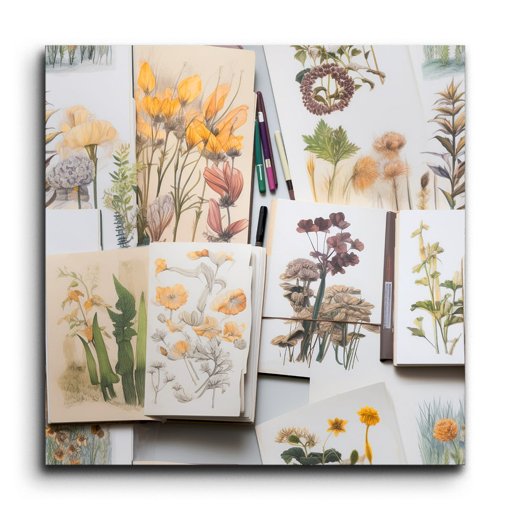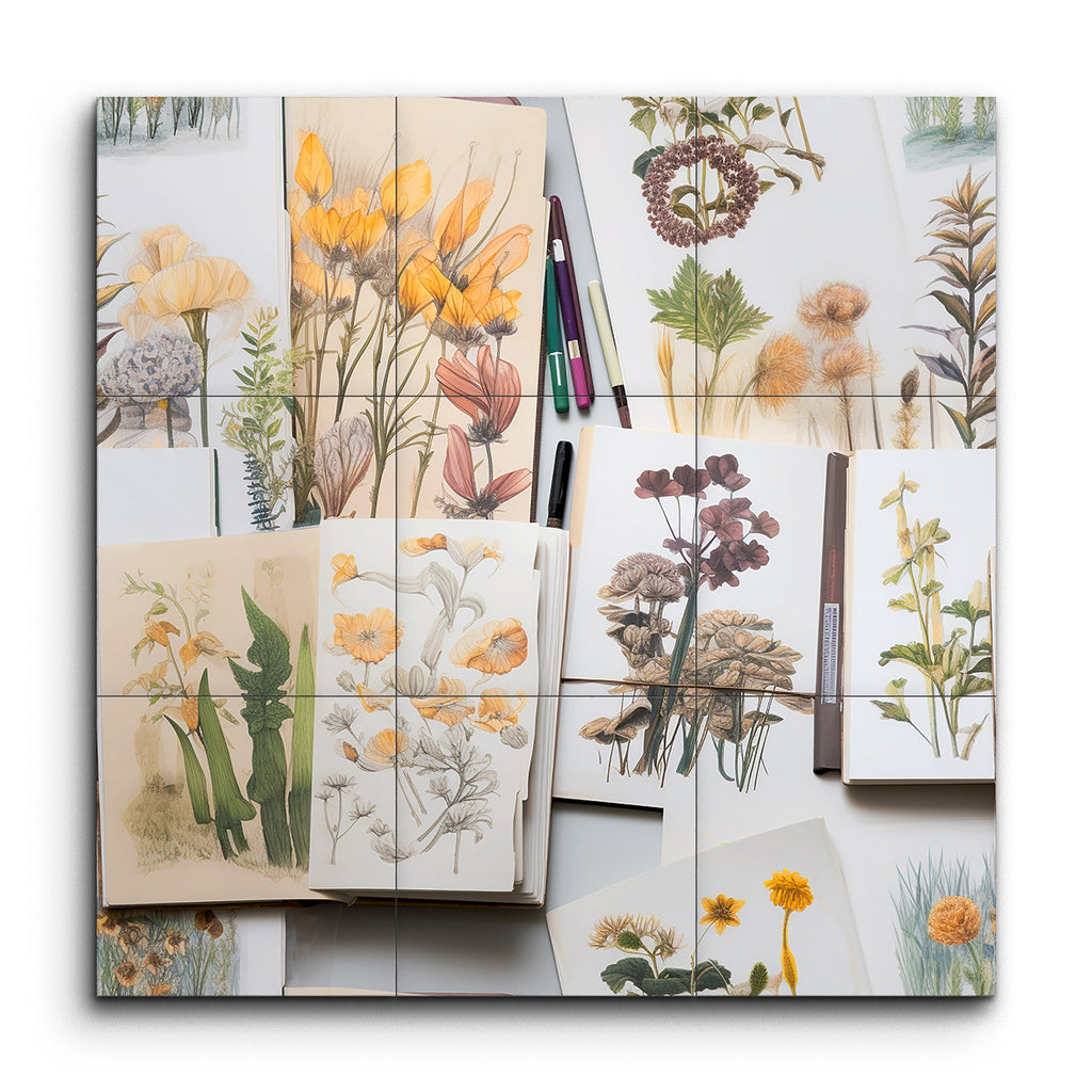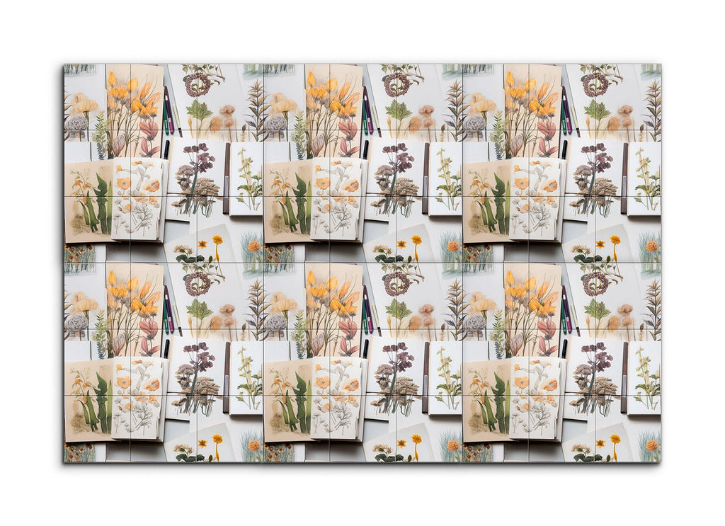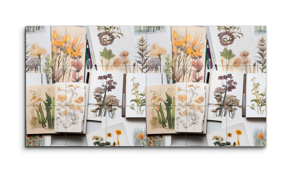 Transform your space with our exquisite tile mural, featuring a stunning collection of meticulously detailed botanical illustrations. Each tile showcases a variety of flora, from delicate flowers to intricate leaves, rendered with precision and artistic flair. The diverse color palette, ranging from soft pastels to vibrant hues, captures the natural beauty and intricacies of each plant. The overlapping arrangement and scattered artist tools evoke a sense of creative process, blending scientific accuracy with aesthetic charm.