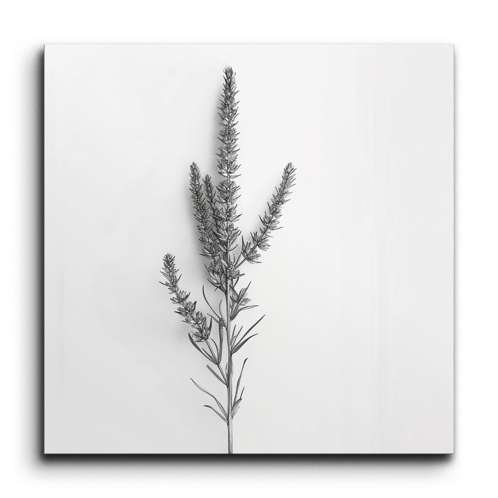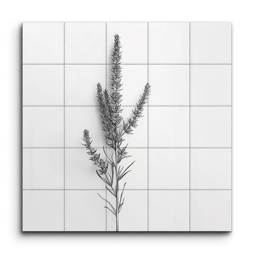 Transform your space with this exquisite tile mural featuring a botanical illustration that captures the delicate elegance of nature. A single plant stem with clusters of small, elongated flowers or buds is rendered in a minimalistic, monochromatic style. Fine, precise lines highlight the intricate arrangement of flower clusters and slender leaves, creating a detailed and realistic representation. The clean, elegant aesthetic and subtle shading bring depth and texture, celebrating the natural beauty of simplicity.