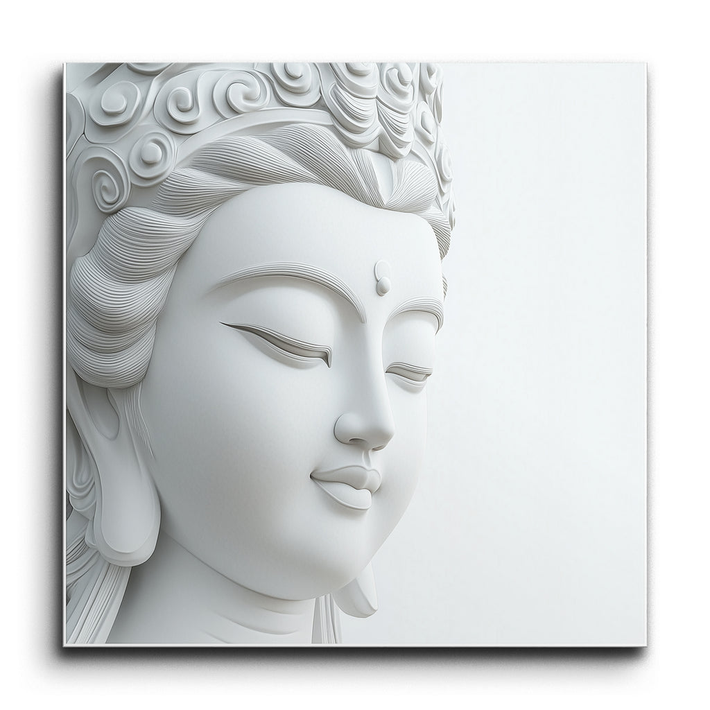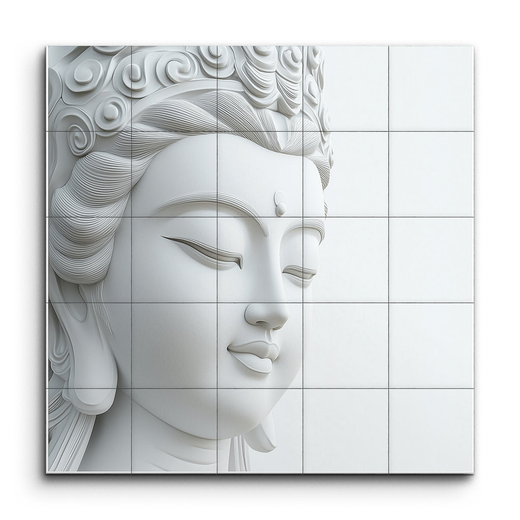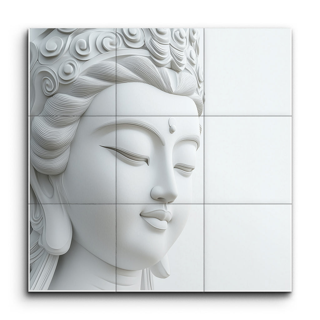 This tile mural presents a serene depiction of a Buddha's face in a monochromatic, almost white palette. The highly realistic style captures the Buddha's calm and peaceful expression with intricate detailing. The face, shown in profile, features closed eyes and a gentle smile, emphasizing tranquility and grace. Meticulously sculpted hair with flowing lines adds movement and texture, while elongated earlobes symbolize wisdom. The minimalist aesthetic and subtle play of light and shadow enhance its lifelike presence, evoking calm and timeless beauty.