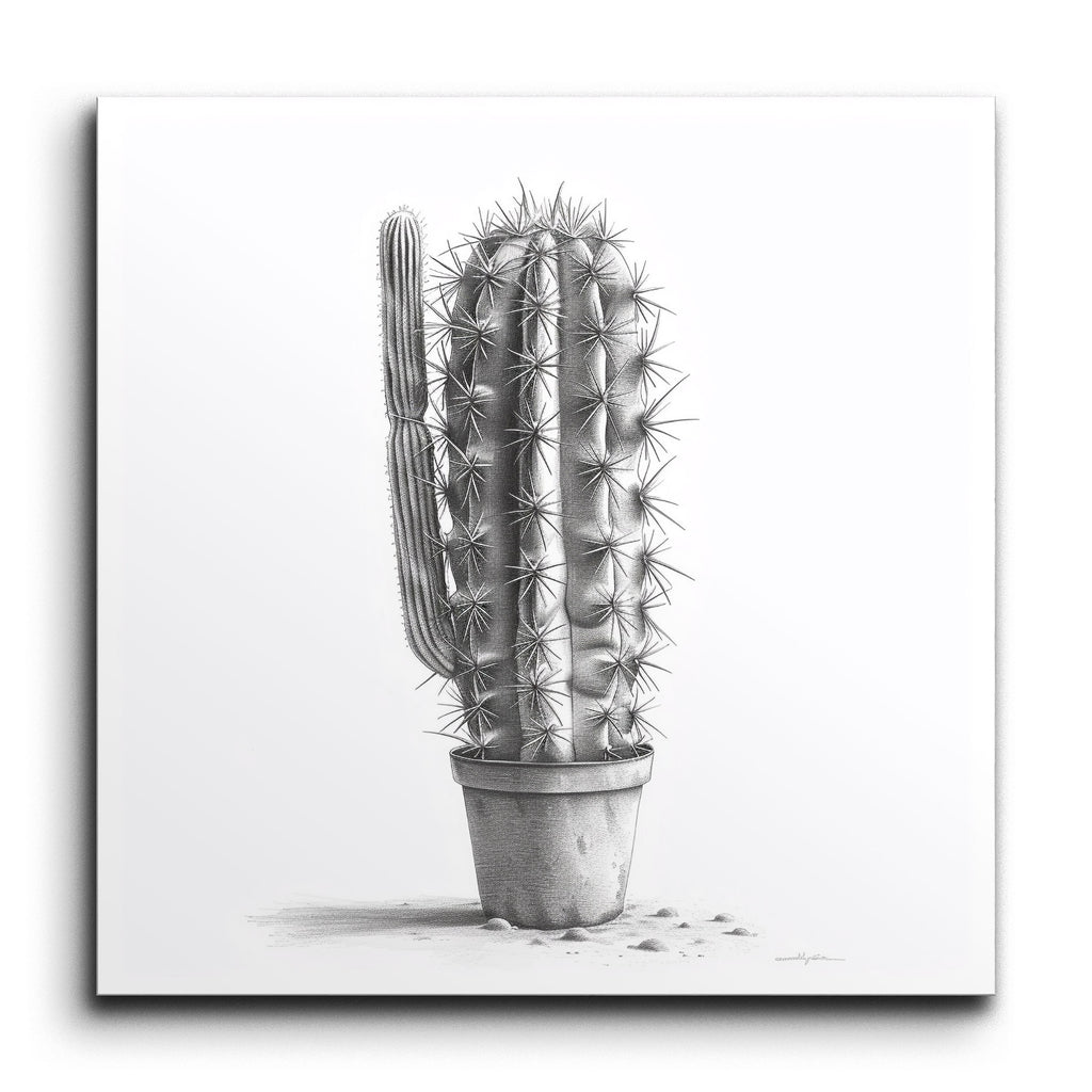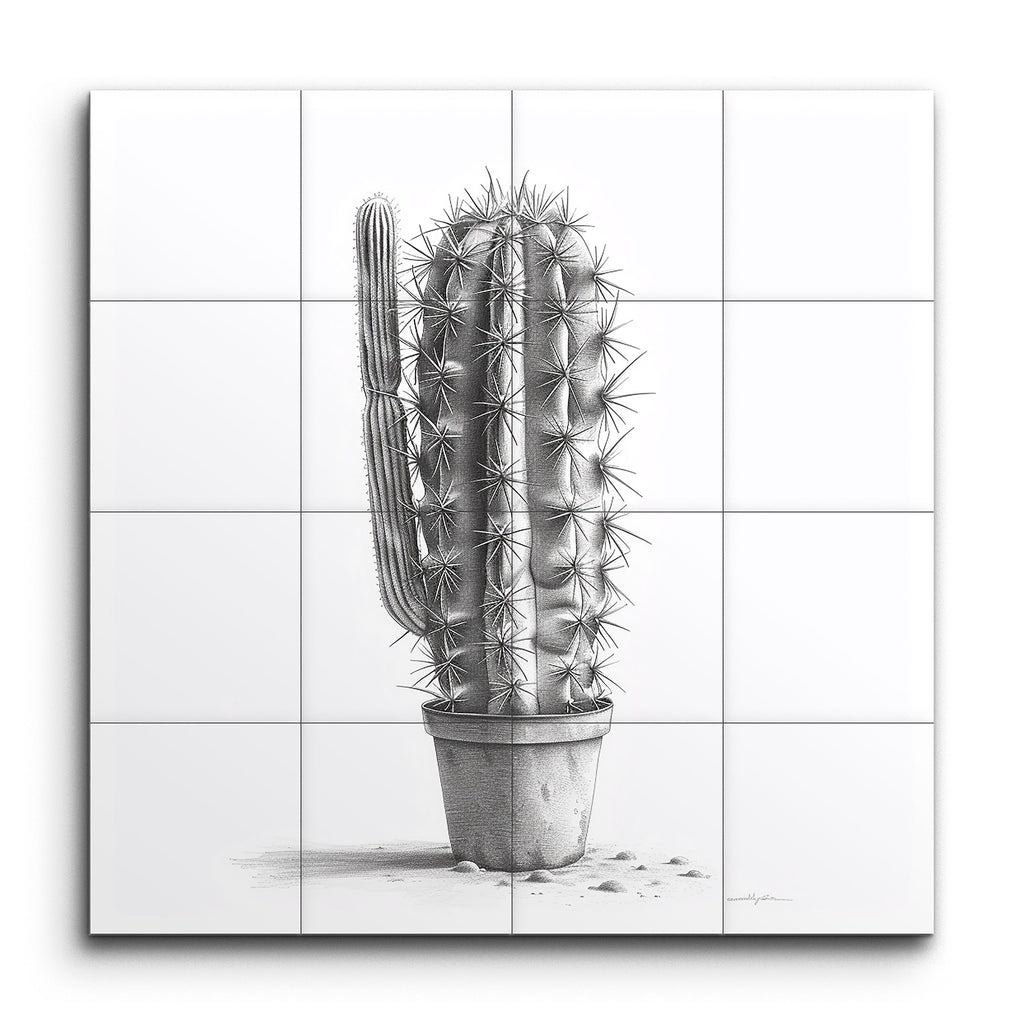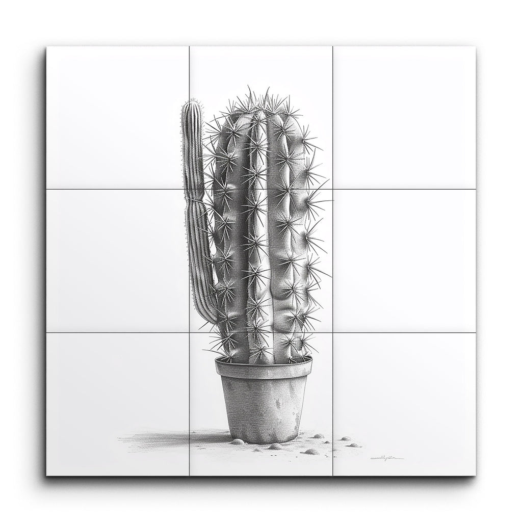 Elevate your space with this stunning black and white tile mural, featuring a meticulously detailed illustration of a cactus in a simple pot. The artwork captures the essence of the cactus with precision, showcasing its spines, ridges, and texture in a highly realistic style. The fine lines and shading create remarkable depth and dimension, while the subtle details, like scattered pebbles at the base, add to the authenticity. This mural is a testament to craftsmanship, bringing natural beauty into your home.