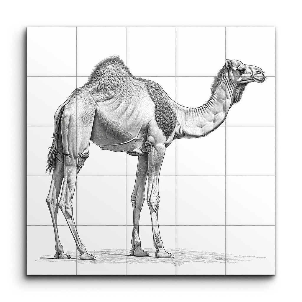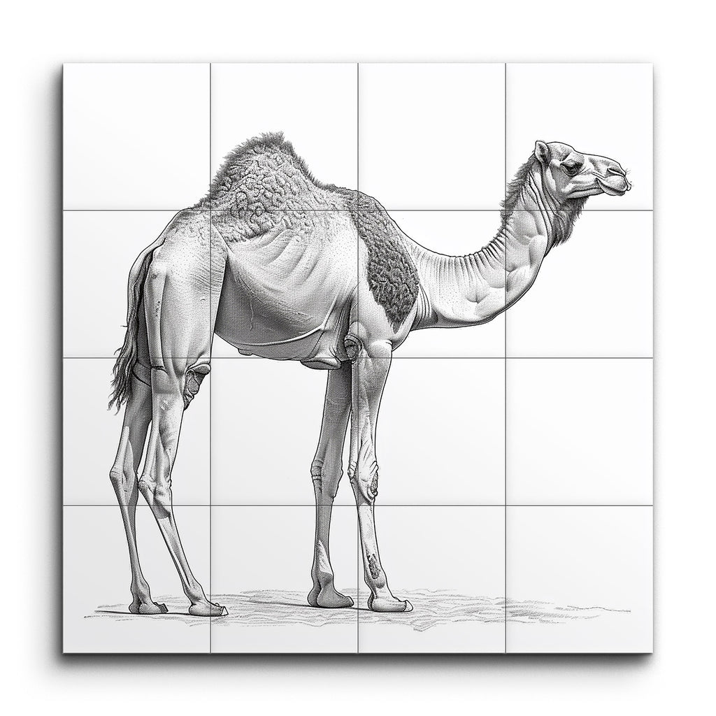 Immerse yourself in the intricate beauty of this tile mural, featuring a lifelike depiction of a camel. Captured in a side profile, the camel stands with its head turned slightly to the right, showcasing its finely detailed textures. The contrast between the short, smooth fur on its neck and the longer, curly fur on its hump is meticulously rendered. With a focus on accuracy and depth, this monochromatic artwork brings the camel's physical structure and strength to life, reminiscent of classic scientific illustrations.