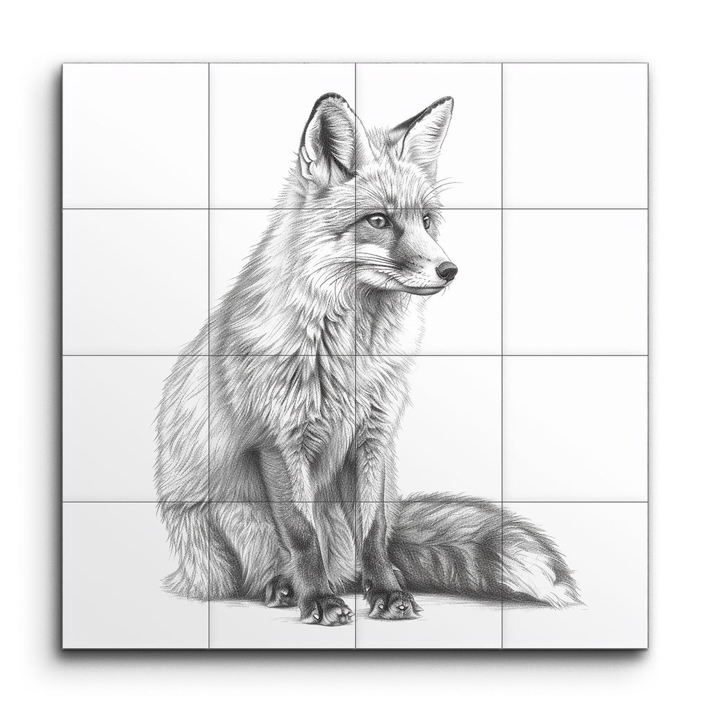 Transform your space with this exquisite tile mural featuring a stunningly detailed and lifelike drawing of a fox. The artwork captures the fox in a seated position, its body slightly turned and its head angled to reveal a captivating profile. Every aspect of the fox's anatomy, from its soft, fluffy fur to its expressive eyes and alert ears, is meticulously rendered with fine lines and shading. The bushy tail, coiled gracefully around its body, adds a touch of natural elegance. This monochromatic masterpiece brings depth and dimension, making the fox appear almost three-dimensional. Perfect for adding a touch of nature's beauty to any setting.