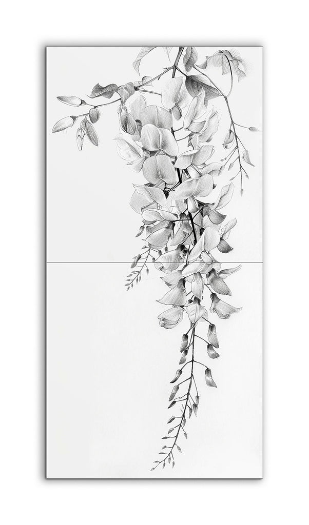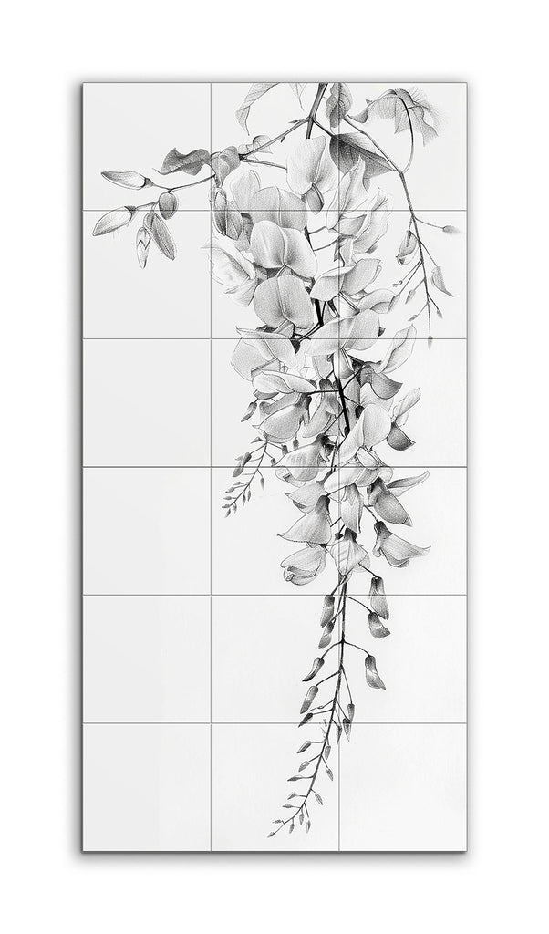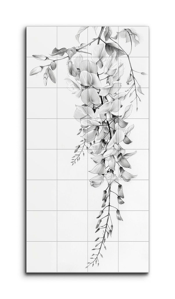 This tile mural showcases a detailed and delicate illustration of a cascading floral arrangement. Rendered in shades of black, white, and gray, the highly realistic style employs fine lines and shading to give depth and texture to the petals and foliage. The flowers hang downward with buds and leaves extending outward, creating a natural sense of movement and flow. The elegant and sophisticated composition, enhanced by the use of negative space, makes the botanical elements appear almost ethereal against the white background.
