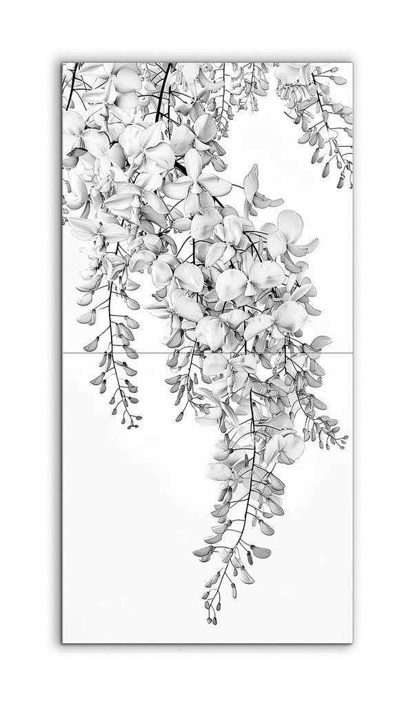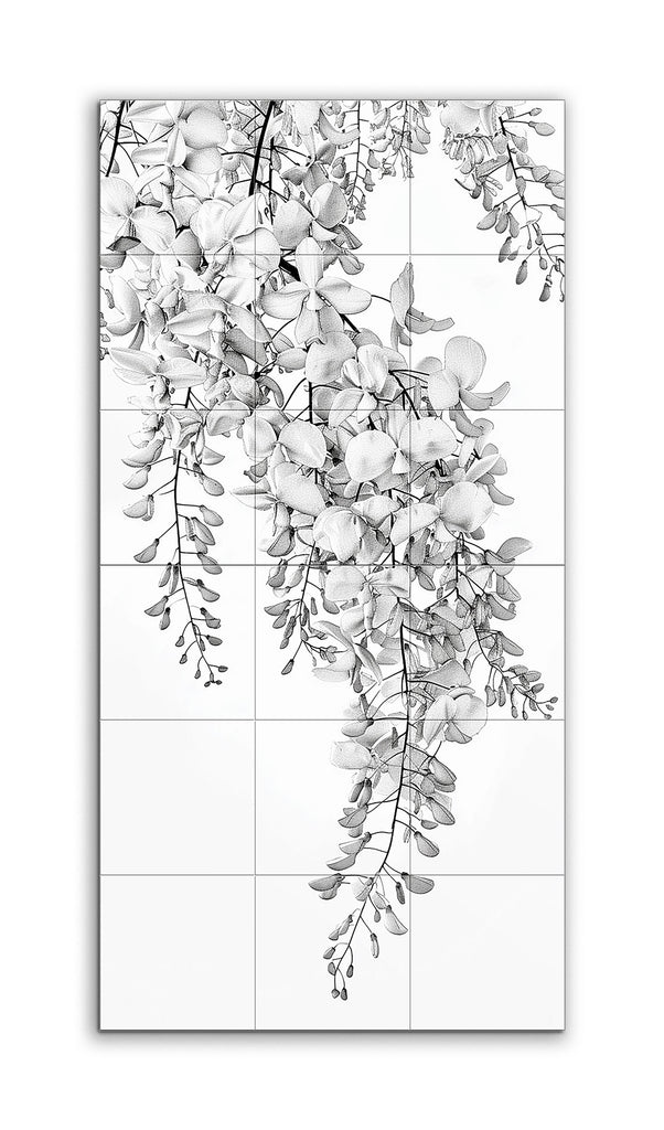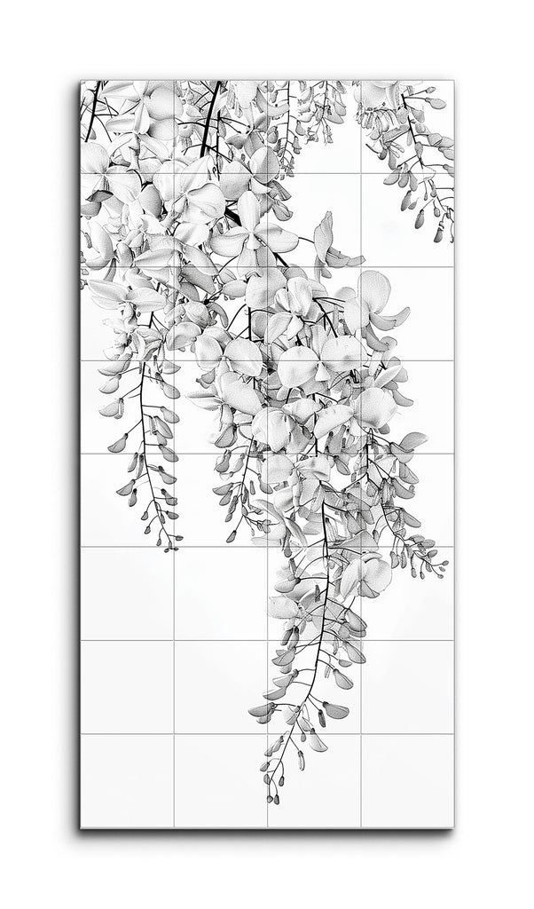 This tile mural presents a meticulously crafted portrayal of cascading wisteria flowers. Rendered in a monochromatic palette of black, white, and gray, the artwork exudes a timeless elegance. The densely clustered blooms, with their delicate petals and elongated leaves, hang gracefully from slender stems, capturing the natural flow and organic arrangement of the flowers. The realistic style, enhanced by precise shading and contrast, imparts a three-dimensional depth, making the blossoms appear almost photographic.