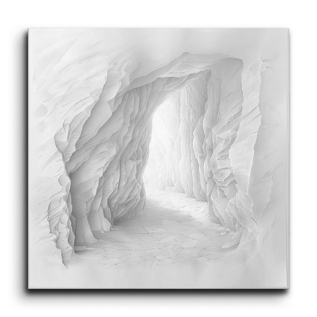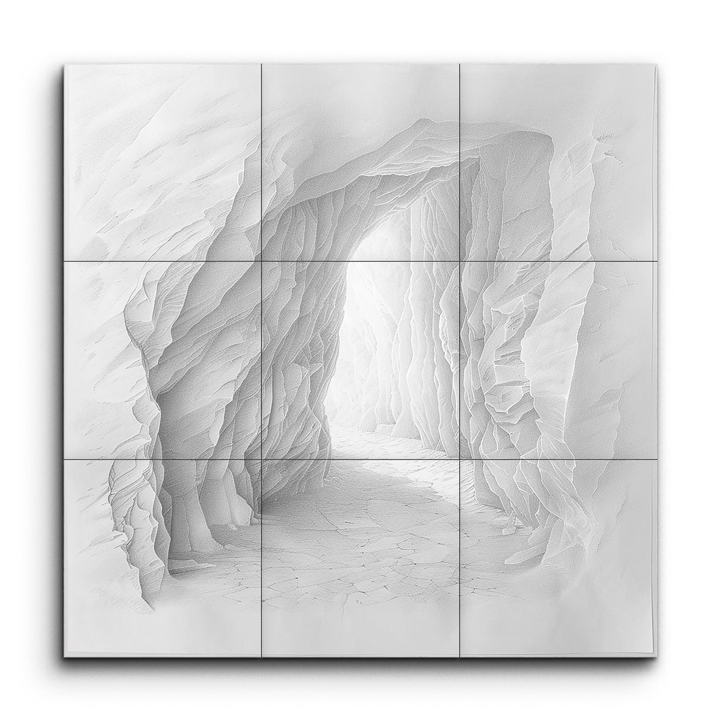 Immerse yourself in the captivating depths of this stunning tile mural, depicting a detailed and intricate cave entrance. Rendered in a monochromatic palette, the artwork showcases the rugged texture and depth of the cave's rocky surfaces with remarkable realism. Jagged, layered rock formations tell a story of natural erosion and geological history, while skillful shading and highlights create a mesmerizing three-dimensional effect. An inner light source casts soft shadows, adding depth and a sense of mystery, inviting you to explore the hidden wonders within.