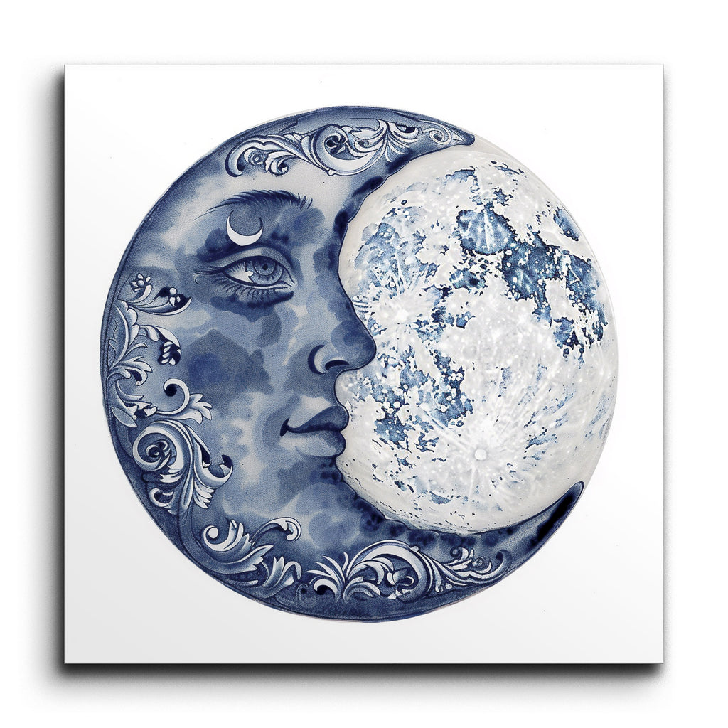 Transform your space with our stunning tile mural, featuring a captivating celestial-themed design. The artwork elegantly balances a stylized crescent moon with a serene human face and intricate floral motifs on one side, while the other half showcases the moon's textured surface with realistic crater details. The harmonious blend of decorative illustration and naturalistic rendering, enhanced by a soothing blue and white palette, creates a mesmerizing focal point that brings a touch of the mystical night sky indoors.