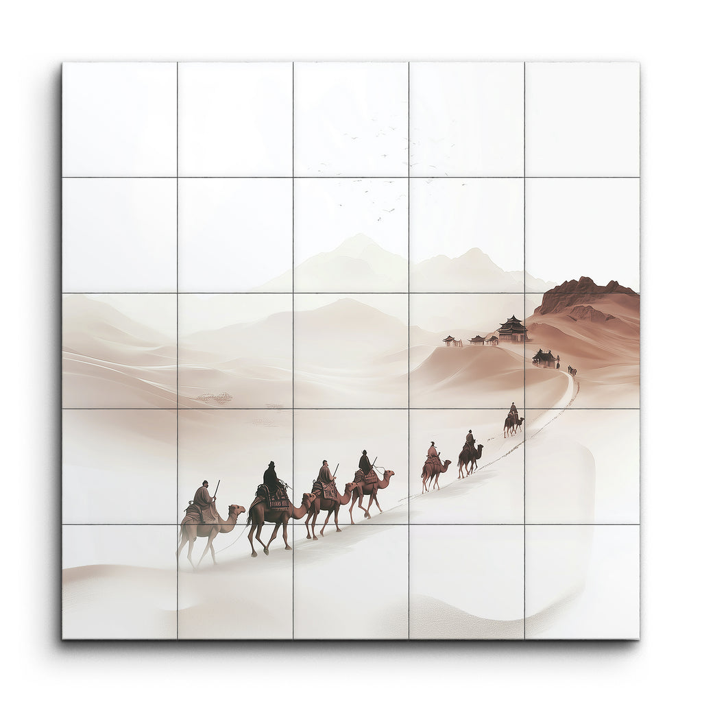 This tile mural captures a serene desert landscape where a caravan of camels and riders traverse a winding path. Soft, muted tones of beige and brown convey a sense of vastness and tranquility. Gently curved sand dunes, with subtle gradients, suggest the play of light and shadow. Faint mountain silhouettes in the distance add depth to the minimalist composition. Delicate details of the figures and camels emphasize their journey through this expansive, peaceful environment.