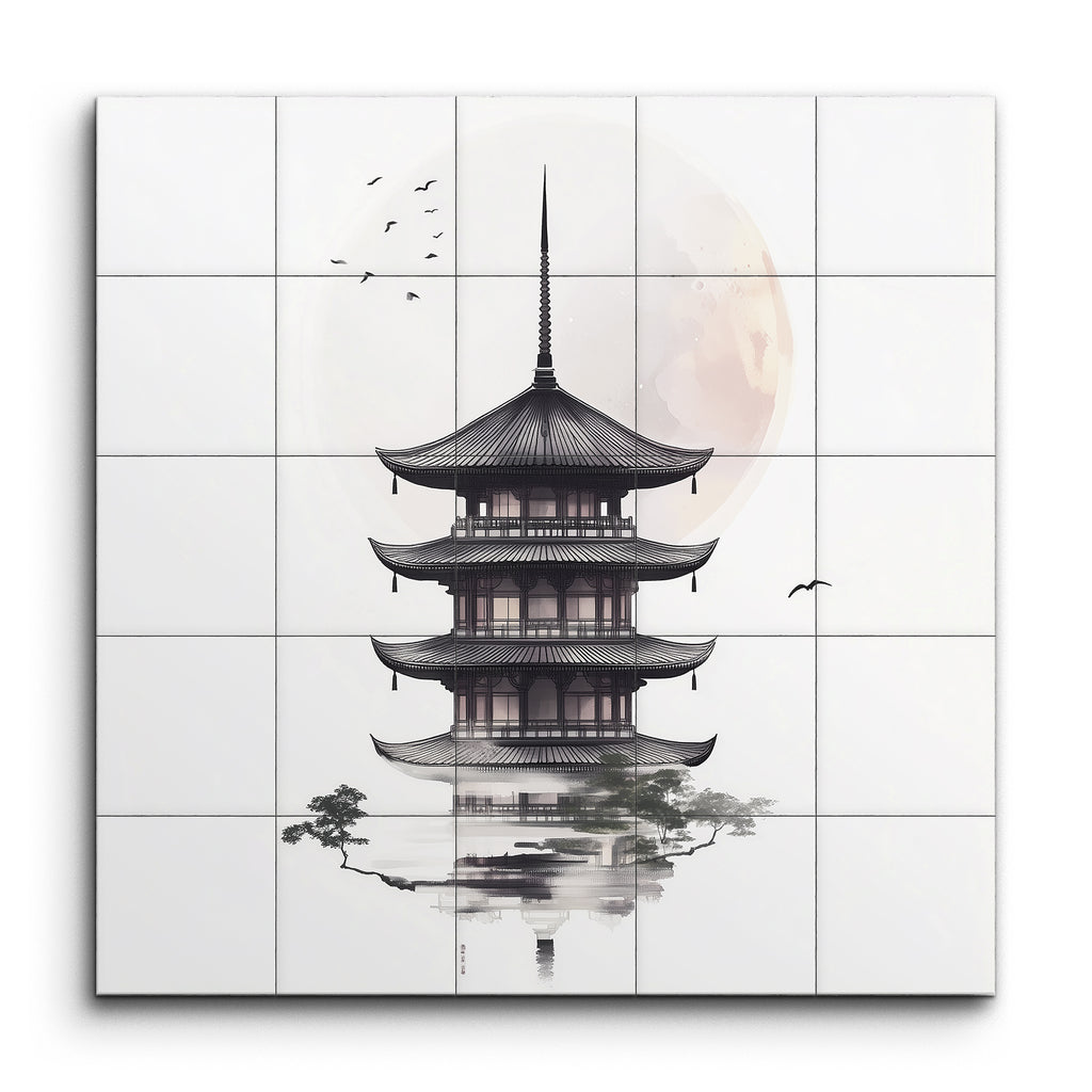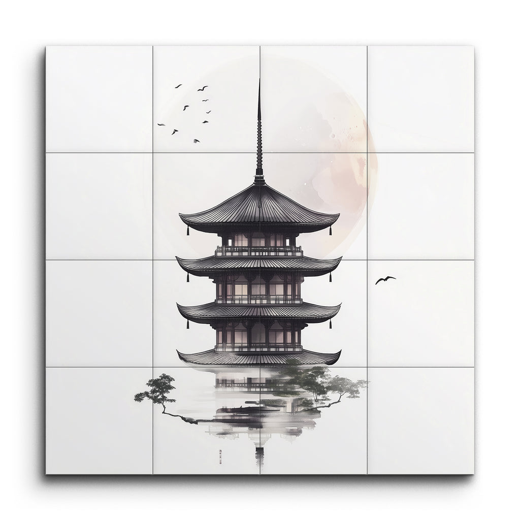 This tile mural showcases a traditional Japanese pagoda with three elegantly curved tiers, each detailed with precise architectural elements that highlight its perfect symmetry. Set in a serene landscape, the pagoda's reflection shimmers subtly in the water below, suggesting a tranquil pond. A large, soft moon in the background casts a gentle glow, enhancing the peaceful ambiance. Birds gracefully fly around the scene, adding movement. The muted palette of grays and pastels creates a calming effect, reminiscent of traditional ink wash art.