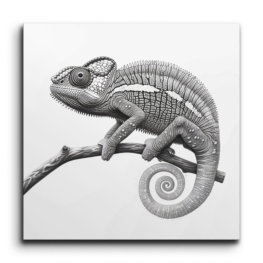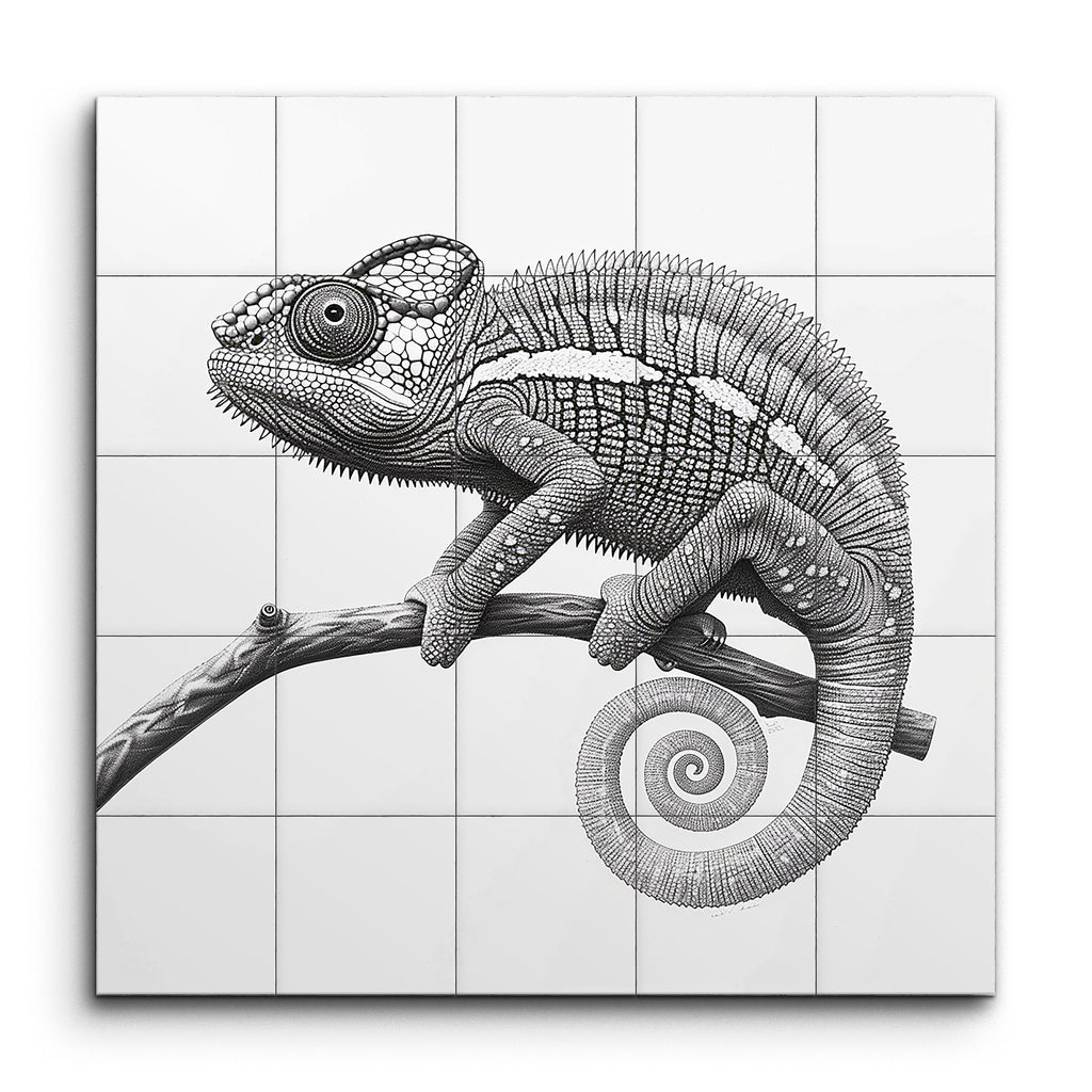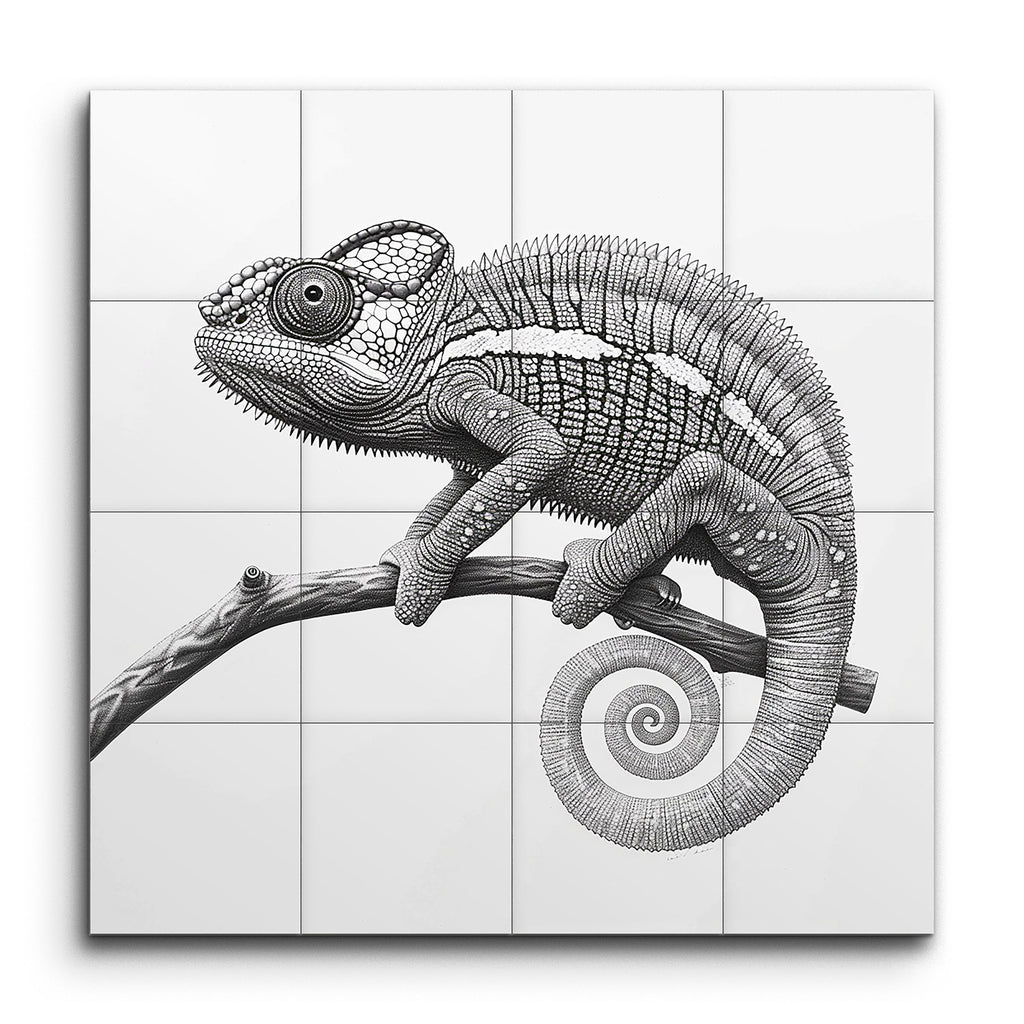 Transform your space with a captivating tile mural featuring a meticulously detailed black-and-white illustration of a chameleon. Perched on a textured branch, this artwork showcases the artist's mastery in rendering lifelike scales, skin, and wood grain. Intricate patterns of lines and dots adorn the chameleon's body, while its eye and spiral tail draw the viewer in with their depth and realism. This pen-and-ink style piece offers a striking blend of fine lines and rich textures, perfect for adding a touch of natural elegance to any room.